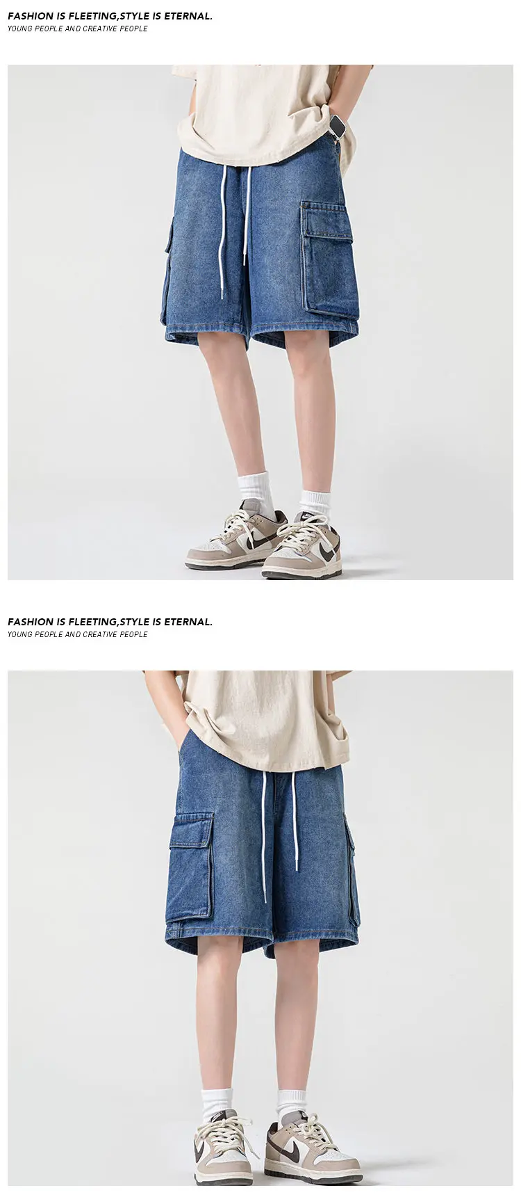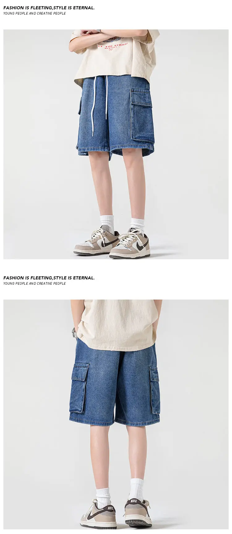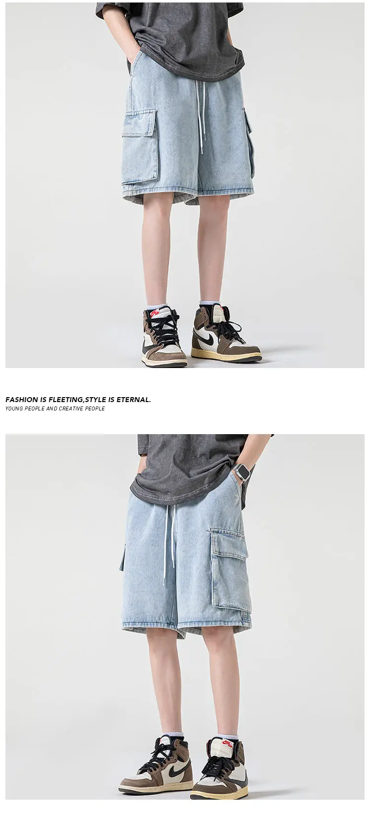 Wiaofellas Summer Cargo Denim Shorts Men Fashion Retro Pocket Denim Shorts Mens Japanese Streetwear Hip-hop Loose Blue Jeans Shorts Men
