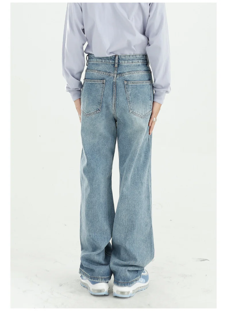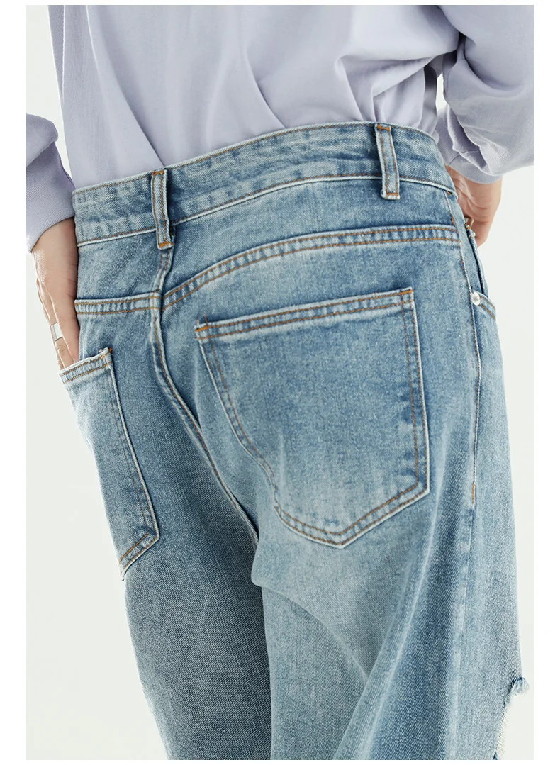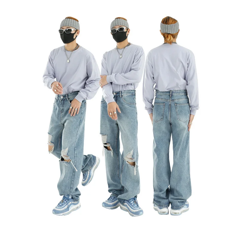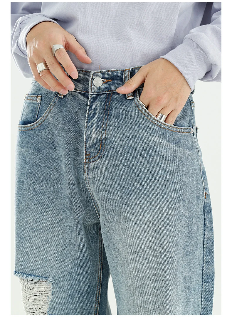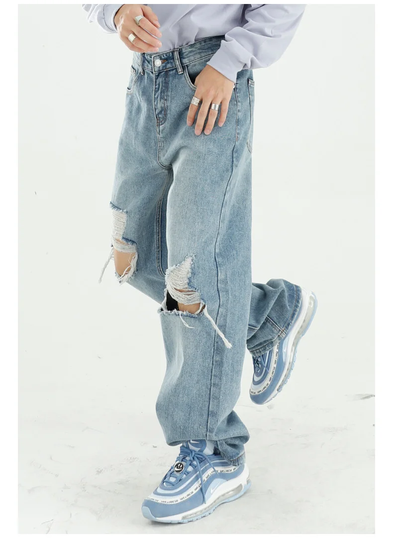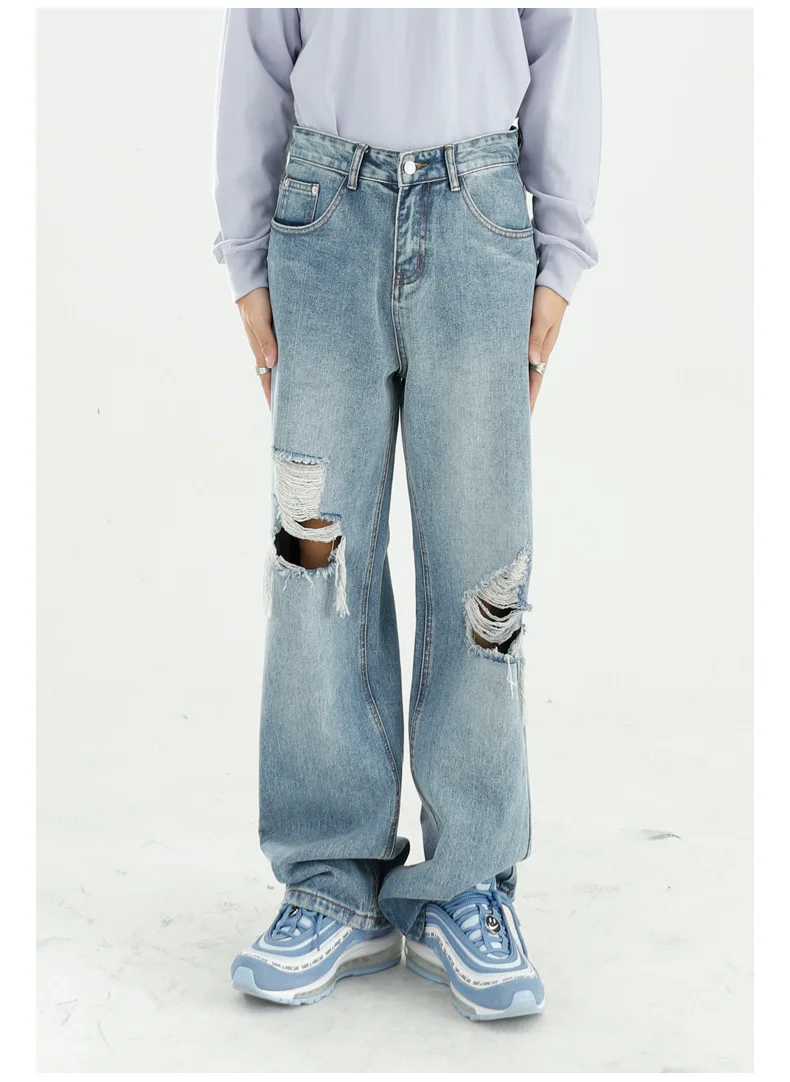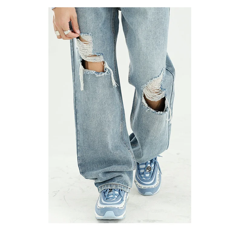 Wiaofellas - Wear Men's New Broken Hole Blue Denim Trousers Fashion Streetwear Loose Straight Jeans Casual Vintage Baggy Pants