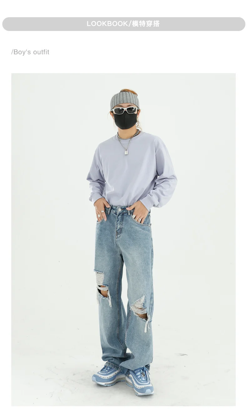Wiaofellas  -  Wear Men's  New Broken Hole Blue Denim Trousers Fashion Streetwear Loose Straight Jeans Casual Vintage Baggy Pants
