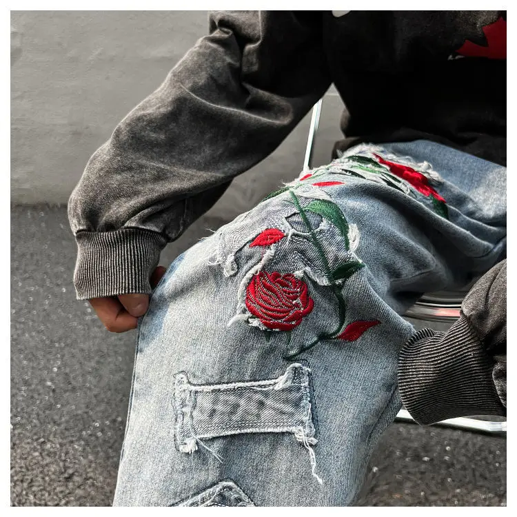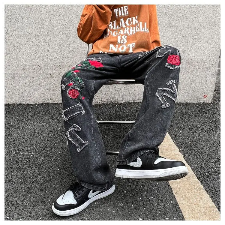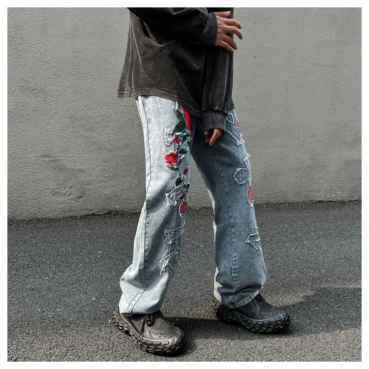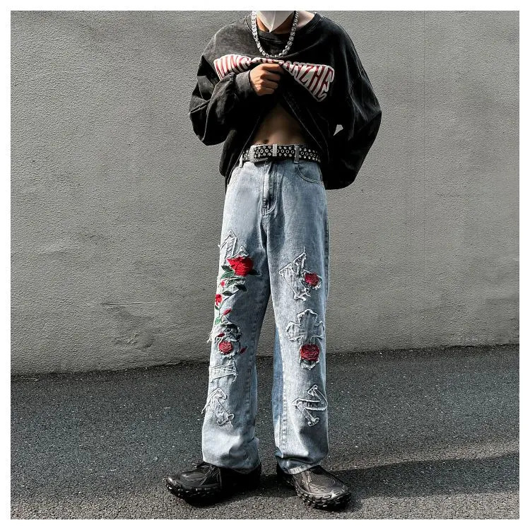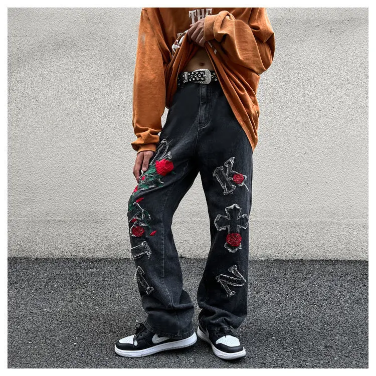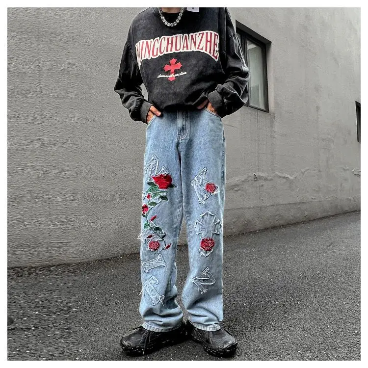 Wiaofellas Y2k Baggy Jeans Europe and America Hiphop Loose Wide-leg Pants Three-dimensional Rose Embroidered Chaogao Street Men Trousers