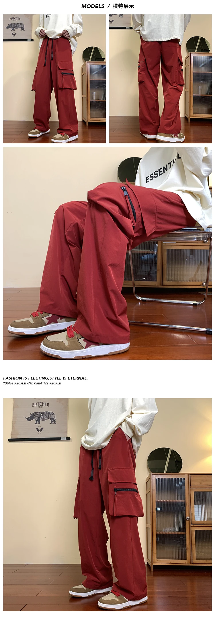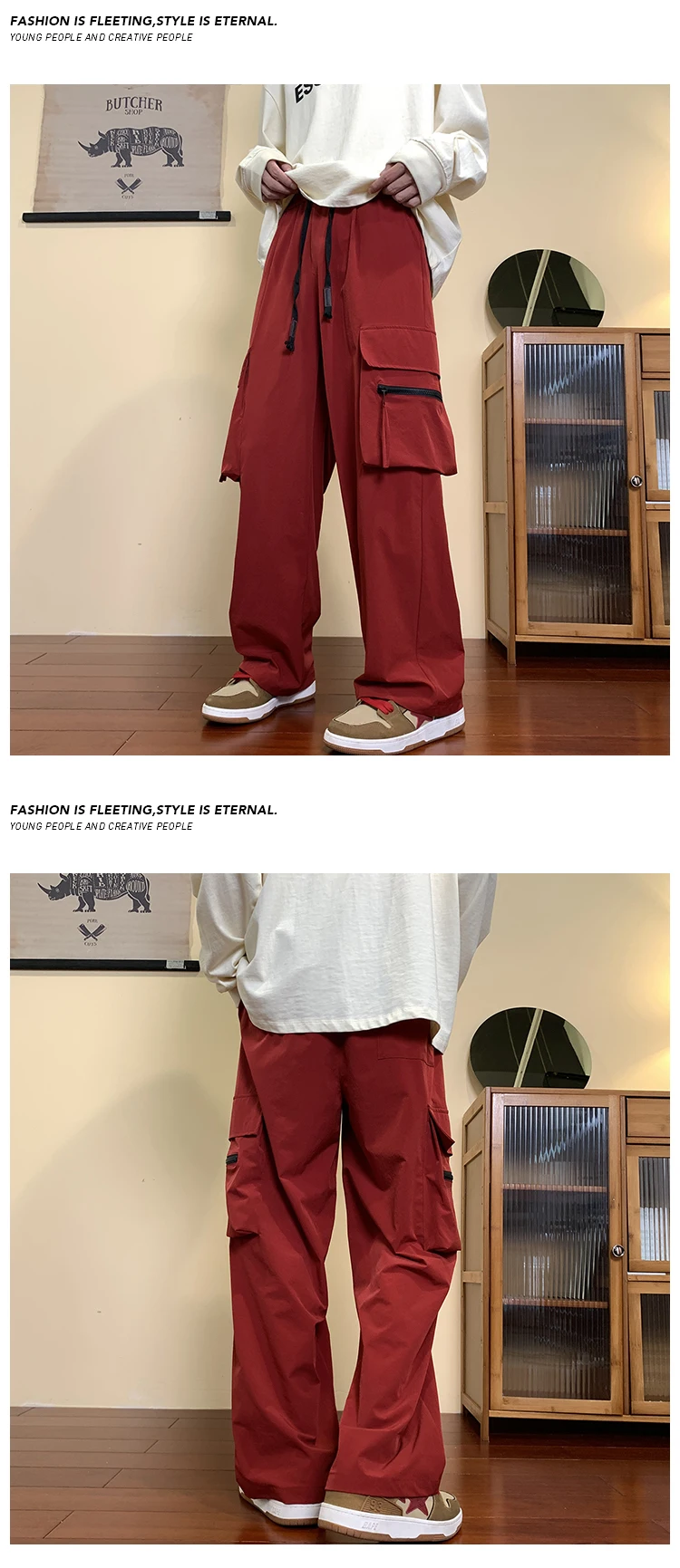 Wiaofellas - Harajuku Red Wide Leg Pants Men Zip Oversize Pockets Trousers High Street Style Sweatpants Unisex Y2K Streetwear Fashion