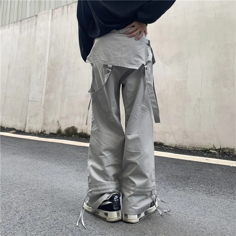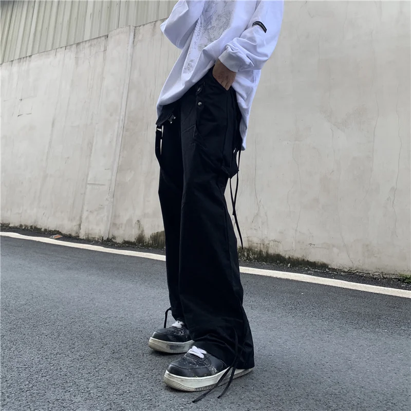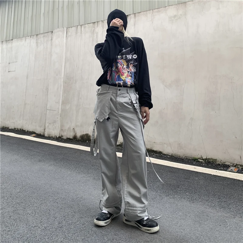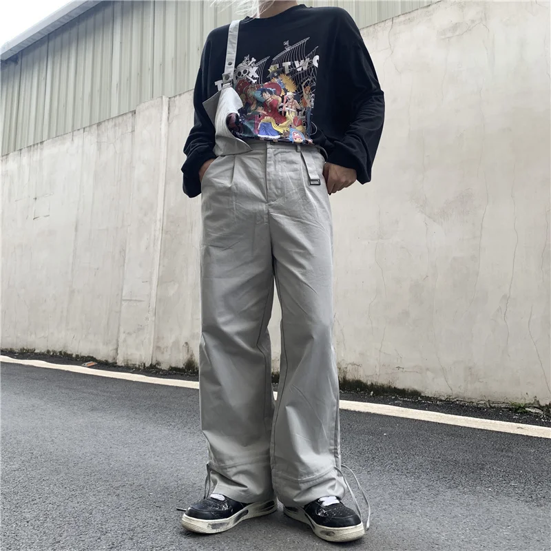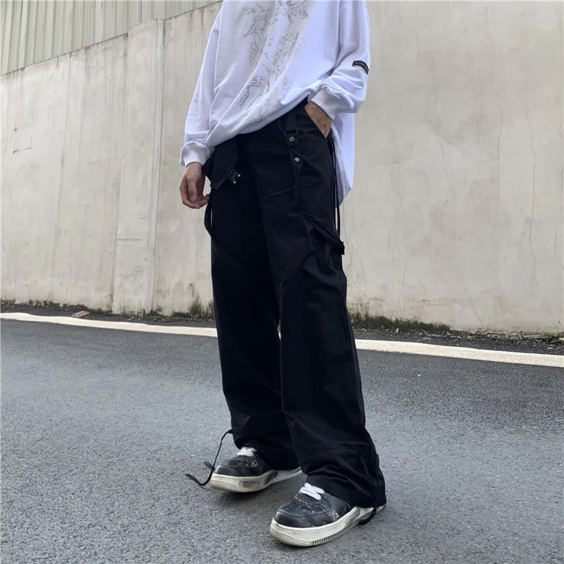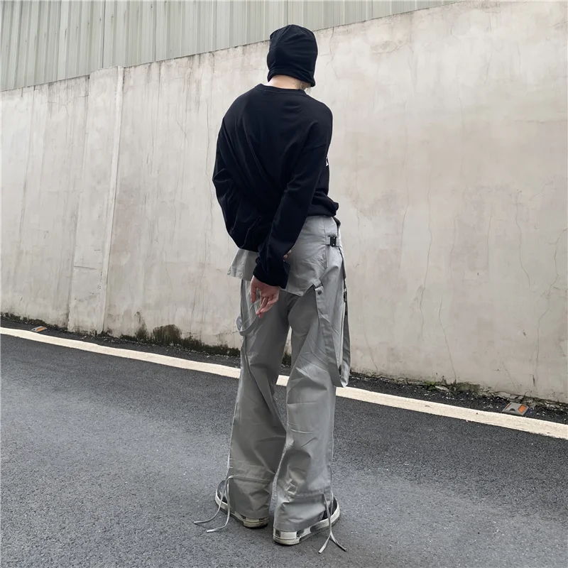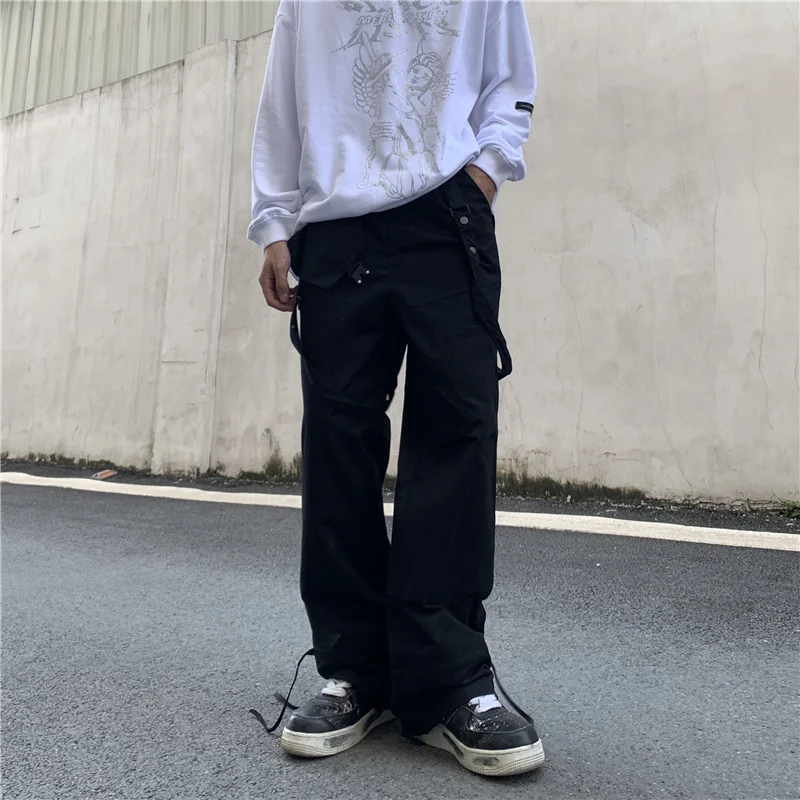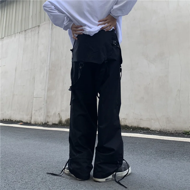 Wiaofellas - High American Street Fashion Design Detachable Suspender Overalls Loose Casual Vertical Straight Men's Long Pants 2Y2252