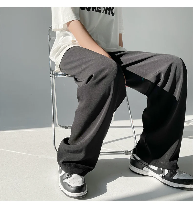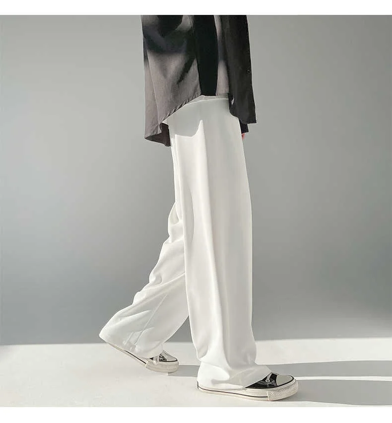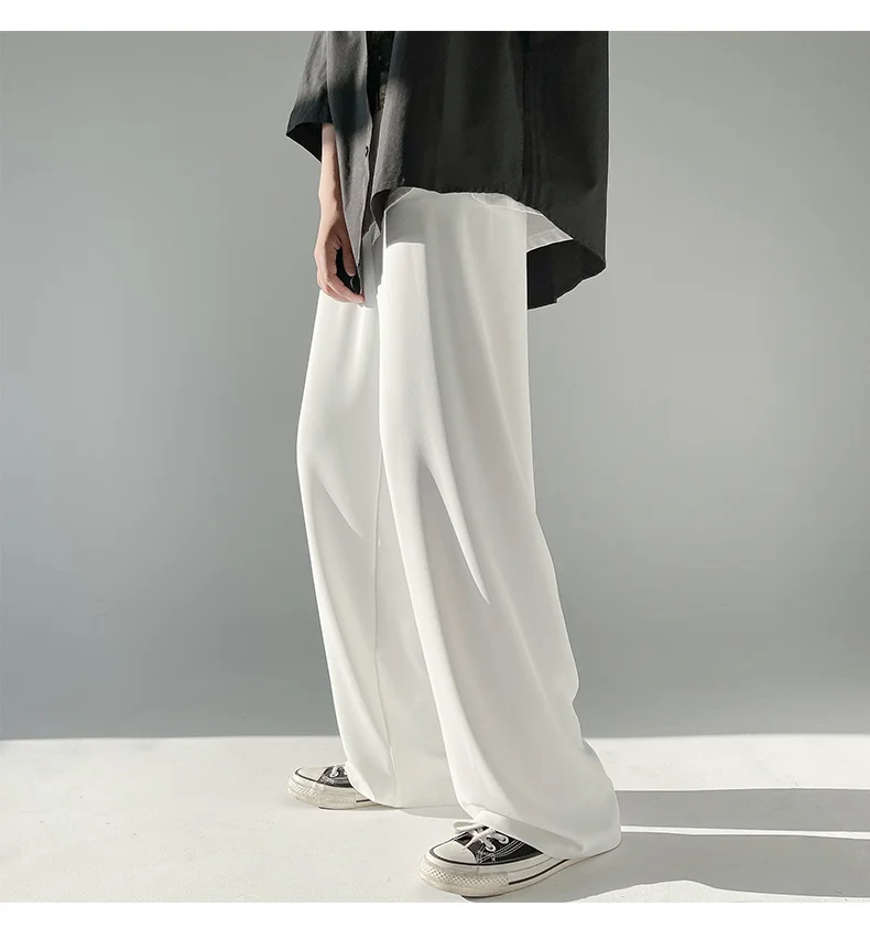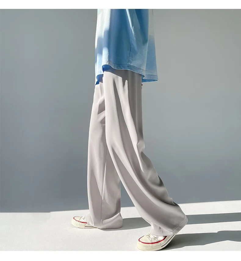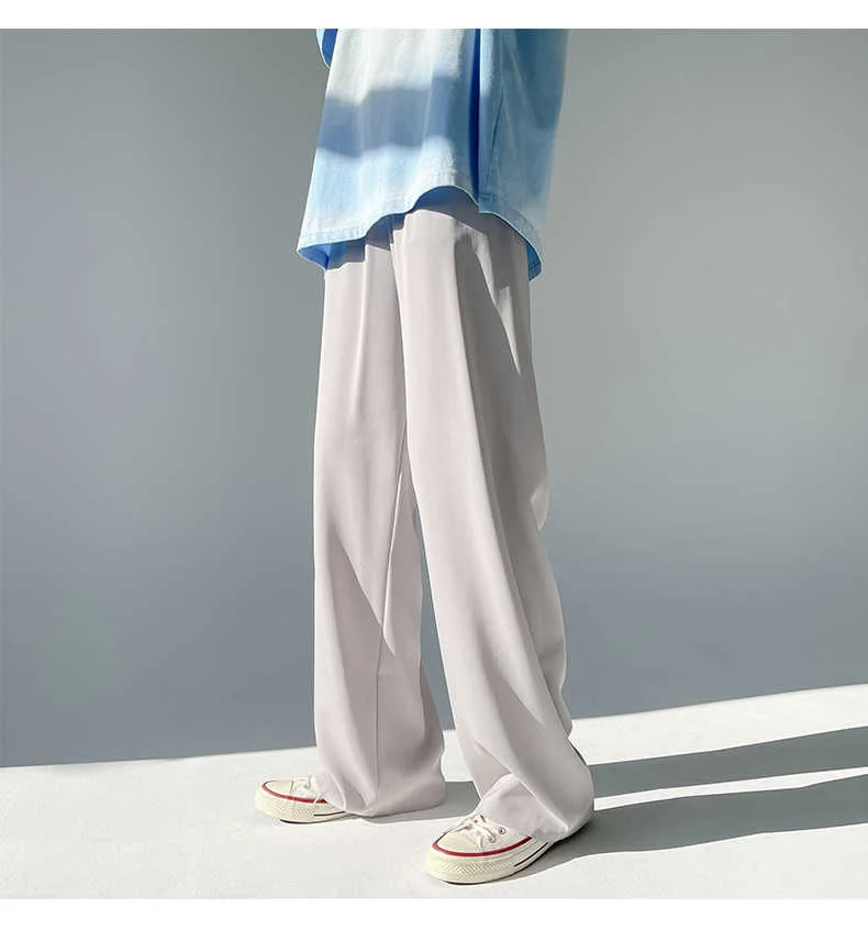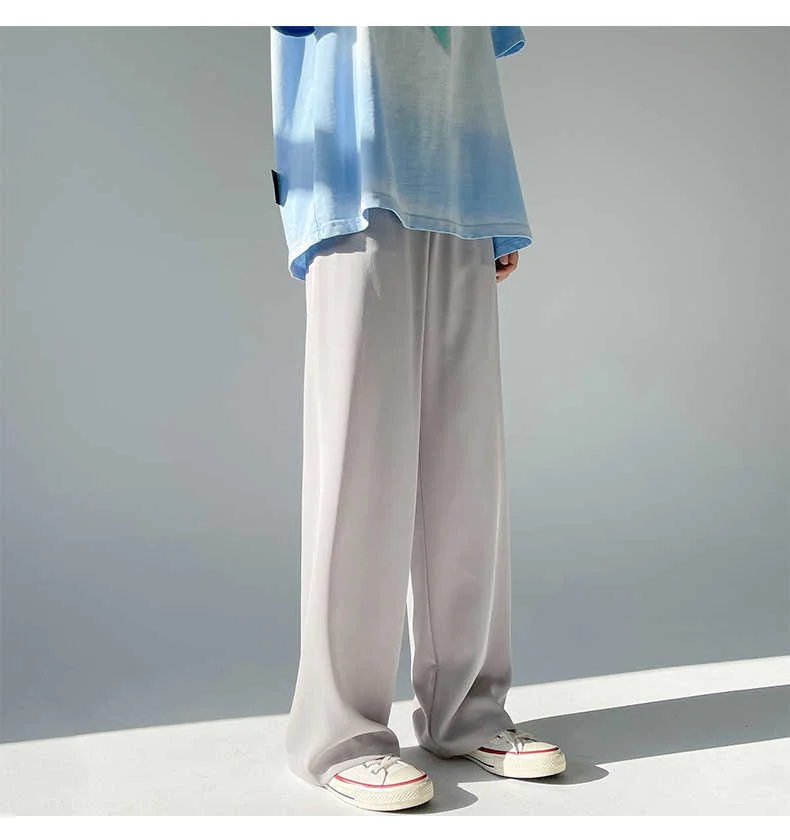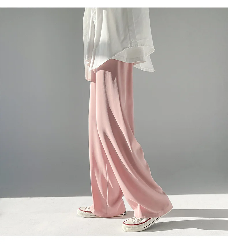 Wiaofellas - Ice Men's Silk Summer Wide Mop Pants New Casual Pants Pink Blue Black White Straight Trousers Korean Long Pants 2Y2225