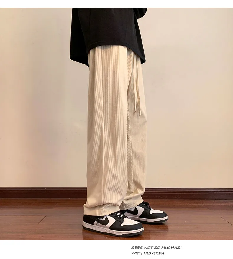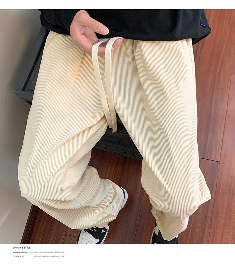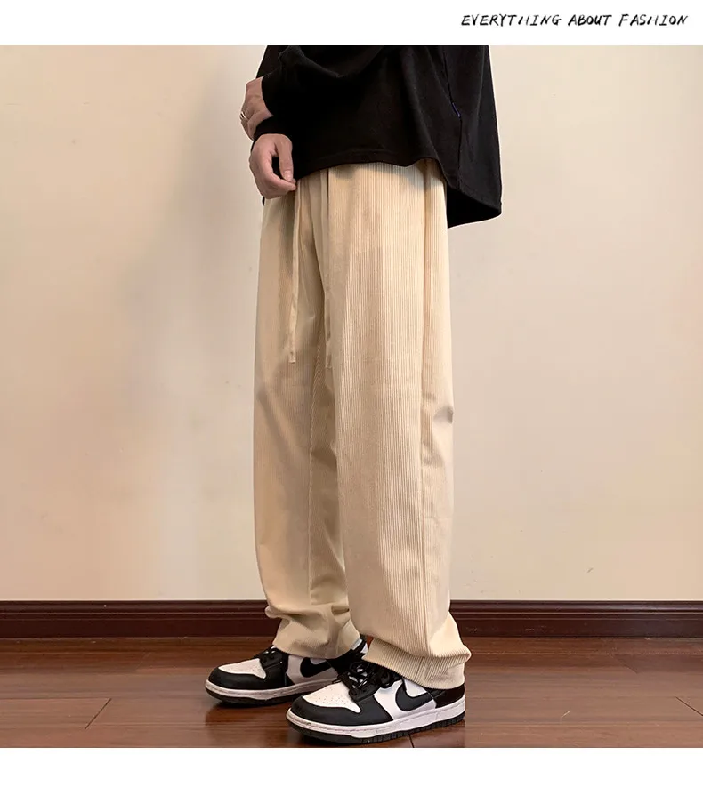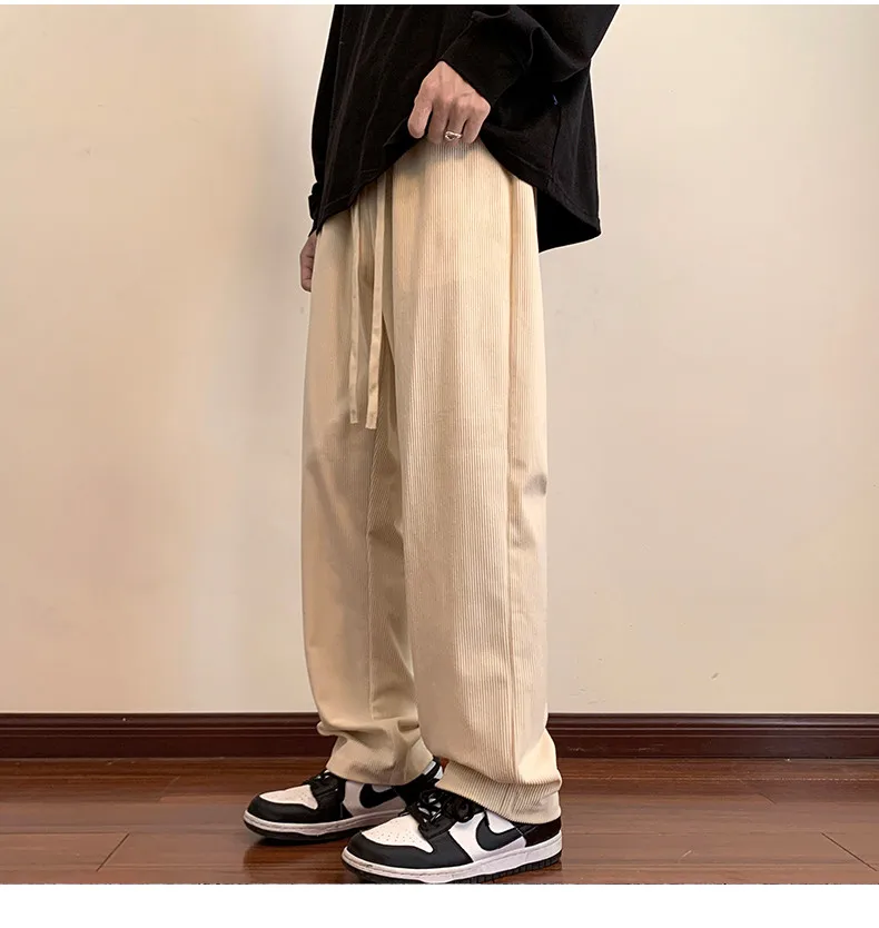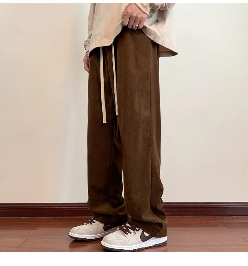 Wiaofellas - Korean Corduroy Men's Casual Pants Drawstring Man Straight Trosuers Streetwear Harajuku Baggy Pants Bottoms Wide Leg Pants