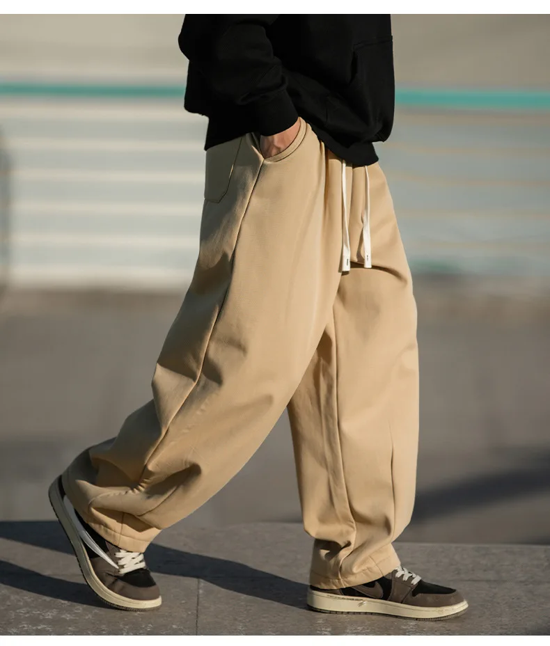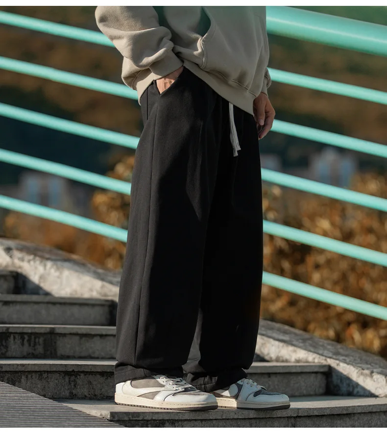 Wiaofellas - Fleece Casual Pants Men Autumn Winter New Baggy 100%Cotton Elastic Straight Leg Pants for Man Korean Streetwear
