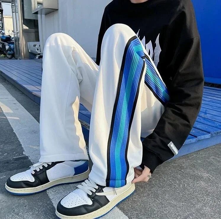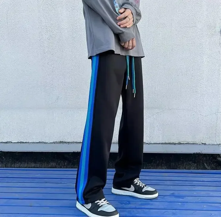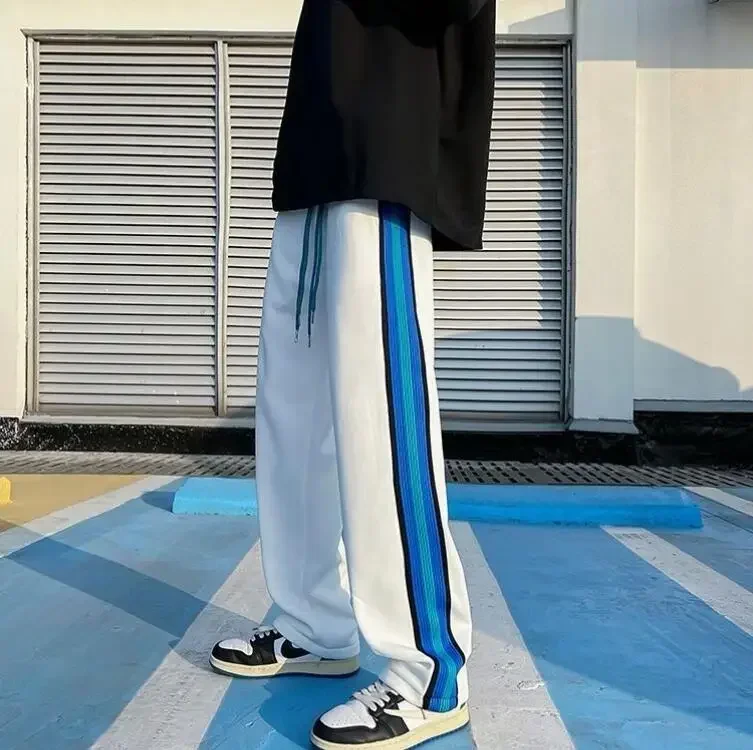 Wiaofellas  -  Trousers Wide Leg Man Sweat Pants Straight Stripe Men's Sweatpants Y2k Harajuku Slacks Elastic Korean Style Tracksuit Bottoms