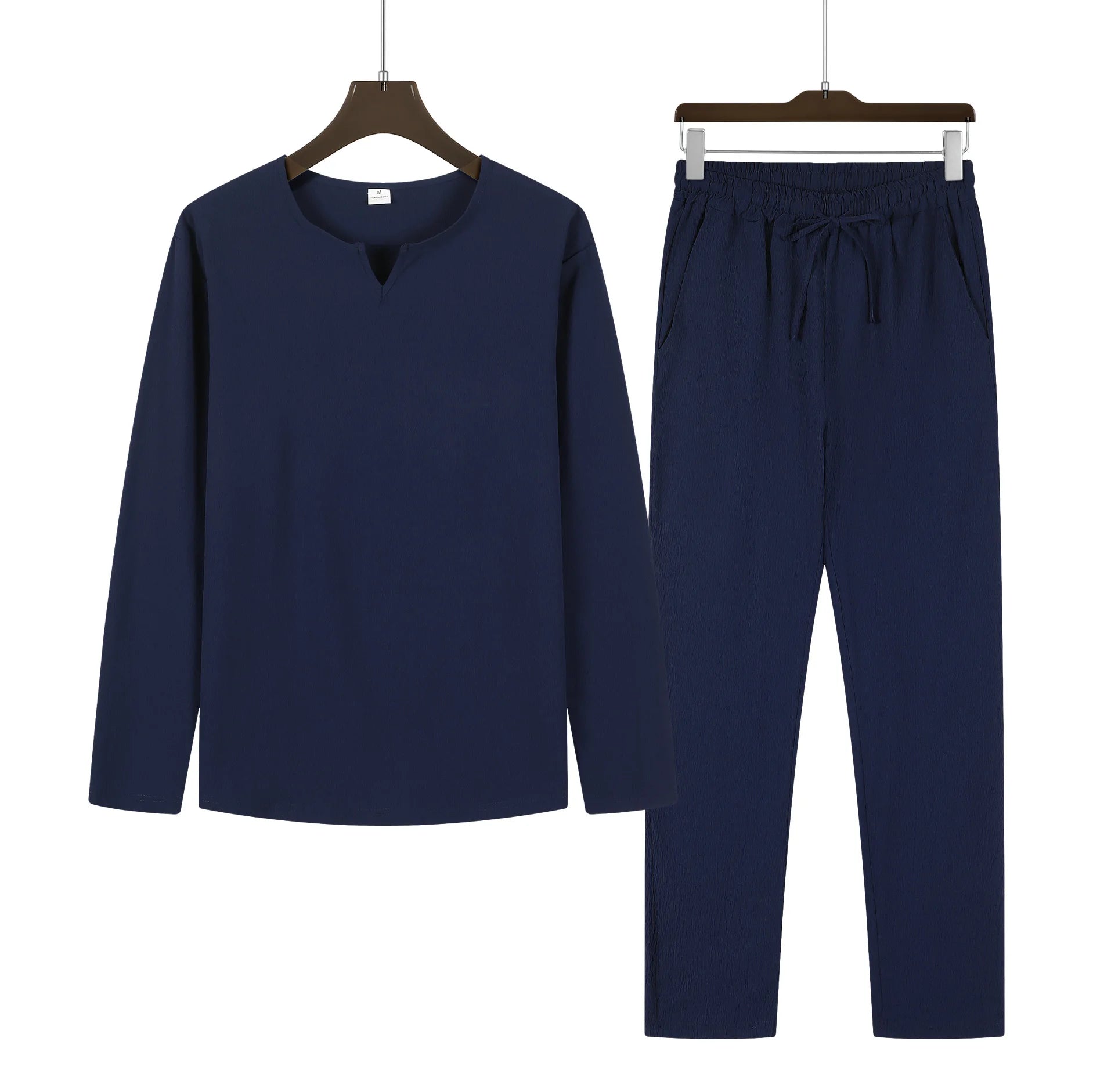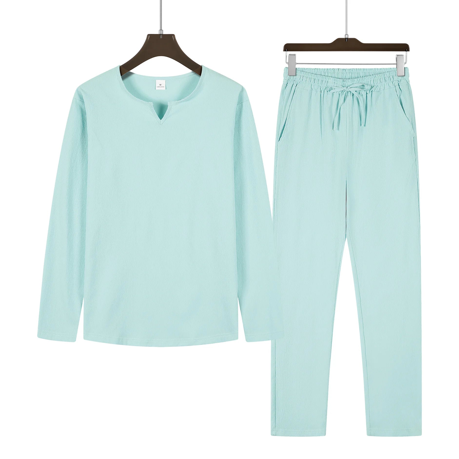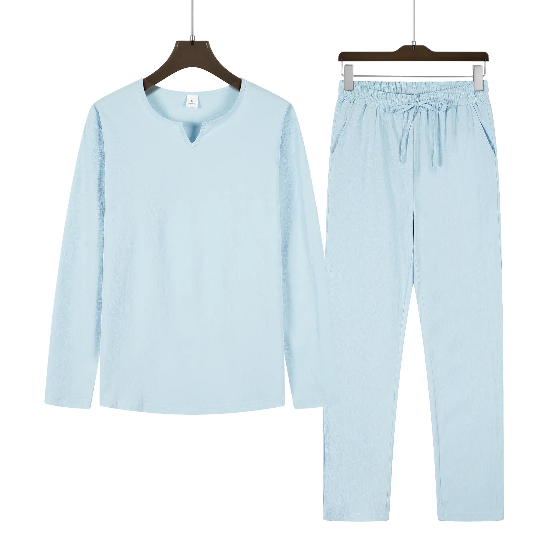 WIAOFELLAS  -  2pcs Set Men's Shirt and Pants Suits for Men Small V-neck Beach Wear Tracksuit Solid Color Shirts Sweatpants Hawaiian Vacat