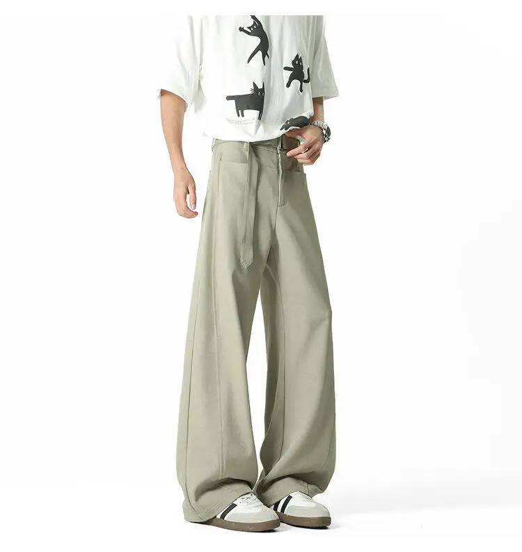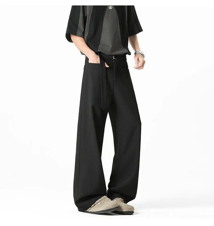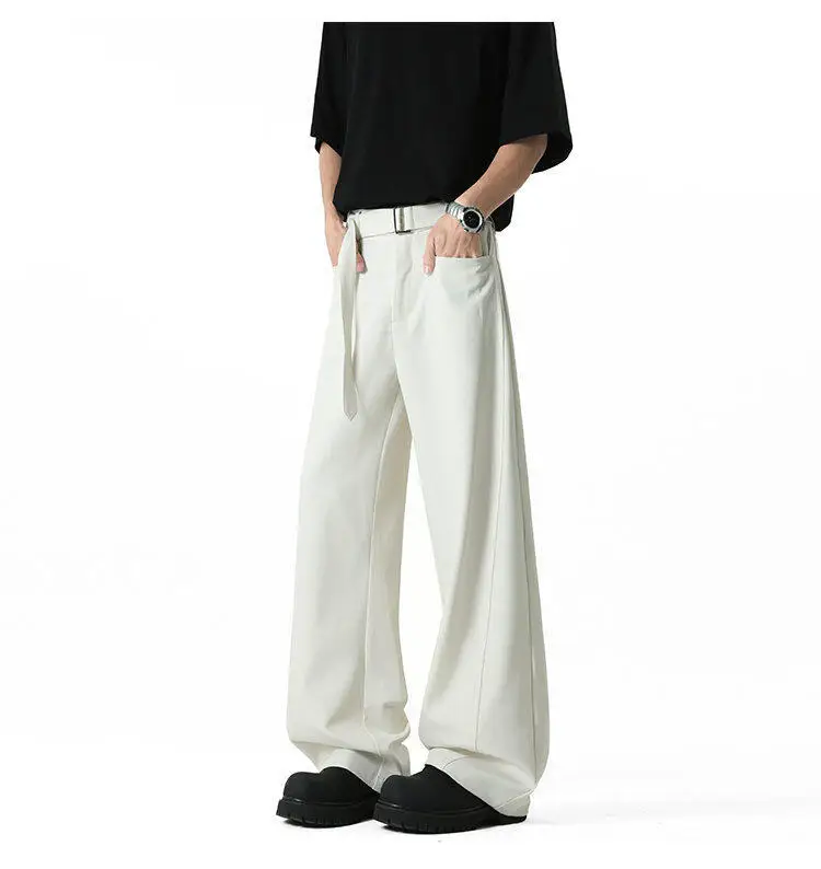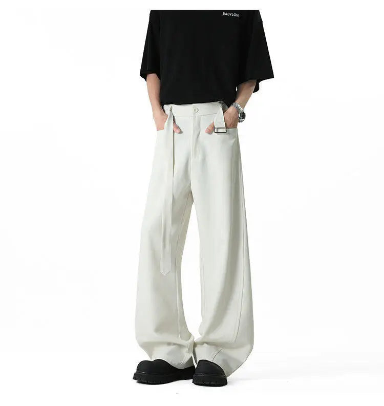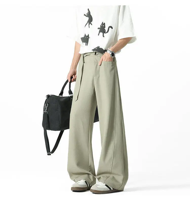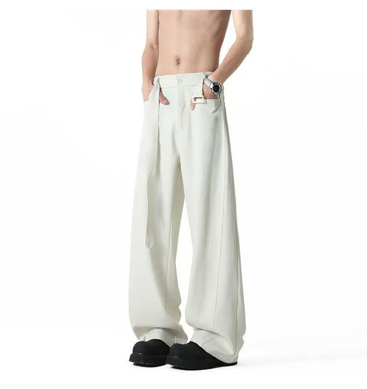 WIAOFELLAS - Belt Design Men's Suit Pants Solid Color Draping Ice Silk Deconstruction Straight Wide Leg Loose Male Bottom Summer