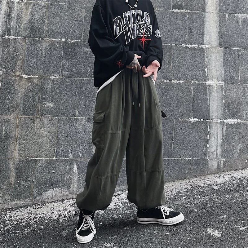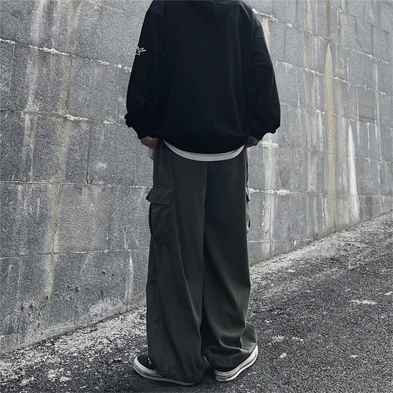 Wiaofellas Big Pocket Cargo Pants Men's Casual Solid Color Straight Pants Baggy Wide-leg Ankle-length Pants Men Elastic Waist Pants
