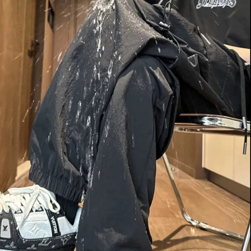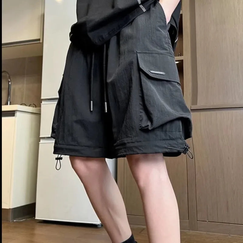 WIAOFELLAS - Cargo Pants Grunge Ice Silk Summer Removable Waterproof Charge Casual Loose Wide-leg Drawstring Solid Color Men's Workwear Pants