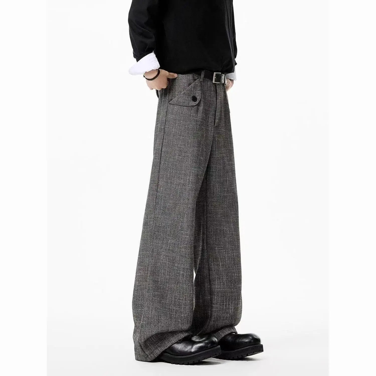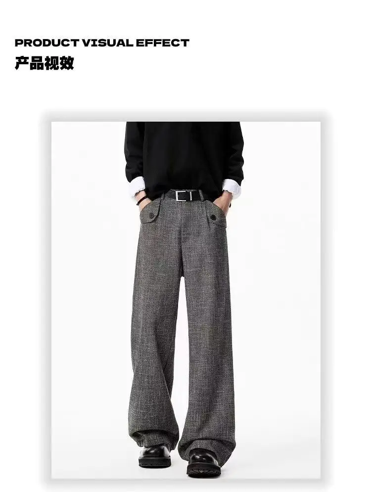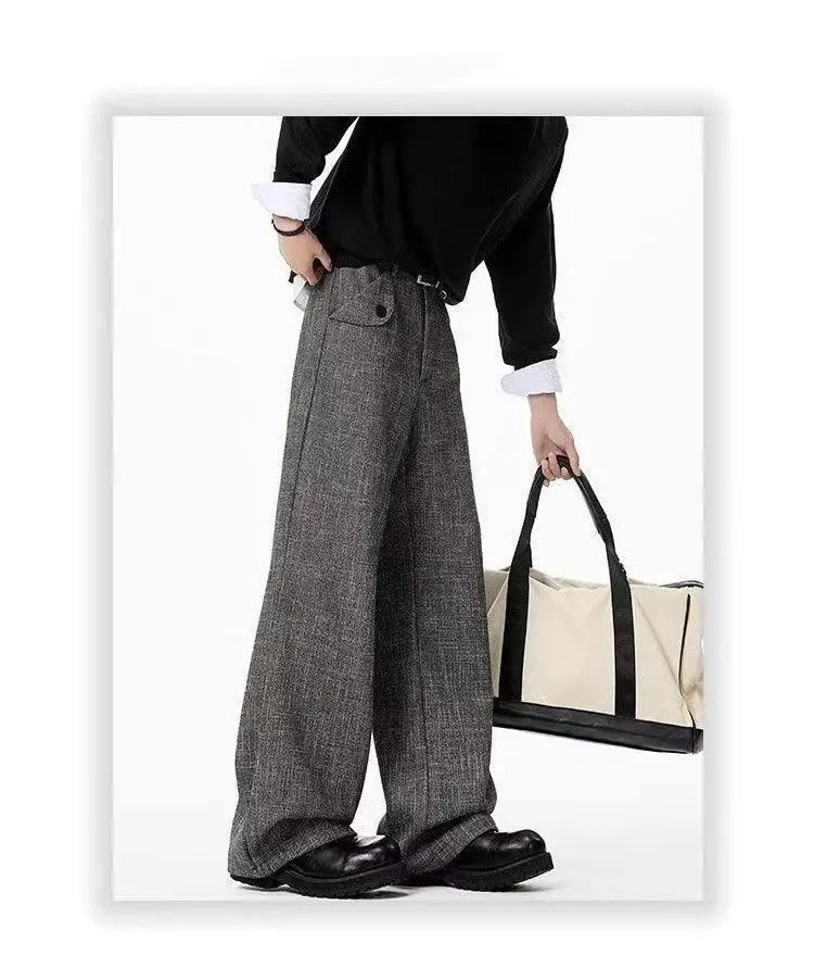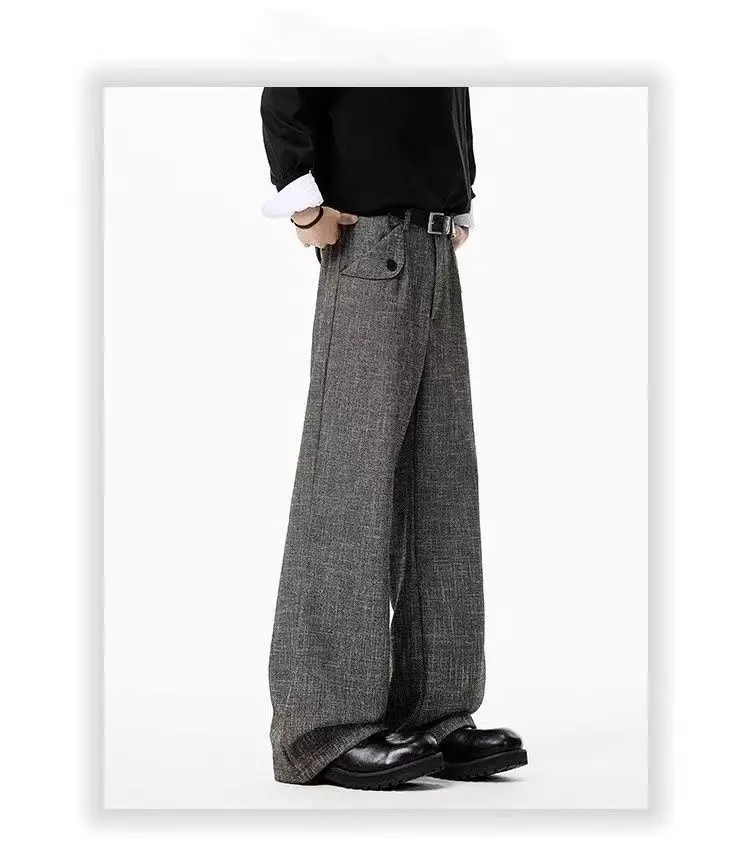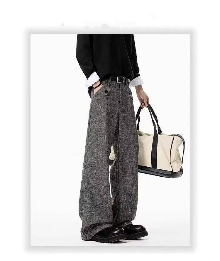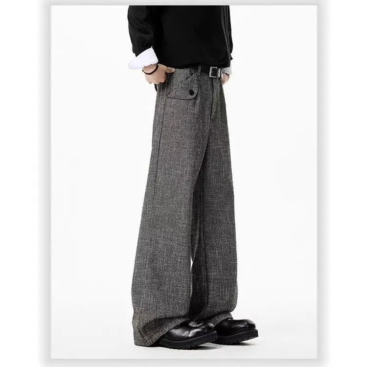 WIAOFELLAS - Grey Straight-leg Casual Pants Men American Streetwear Brand Retro and Stylish Loose Wide-leg Plaid Suit Pants