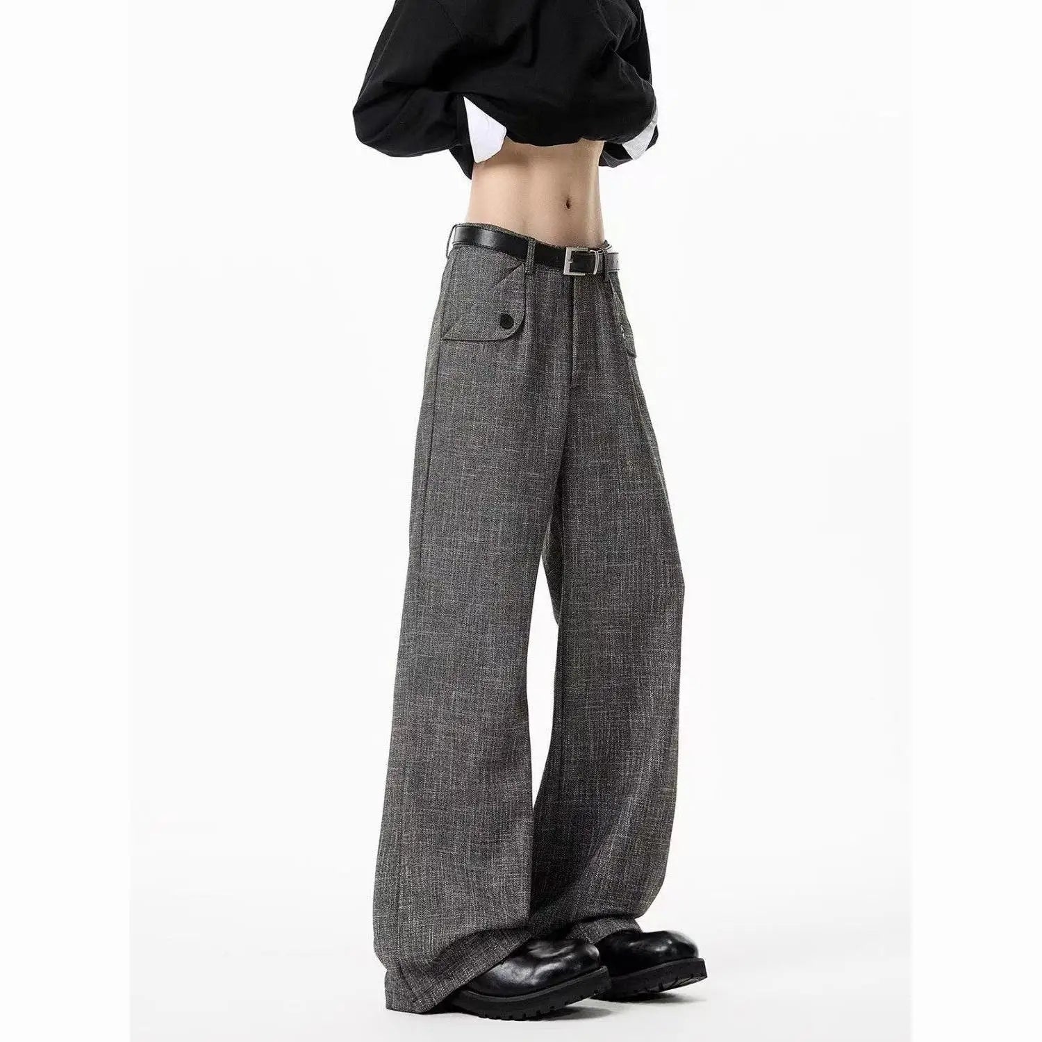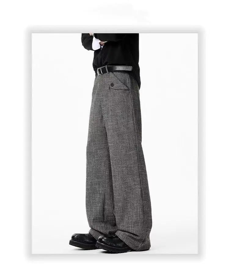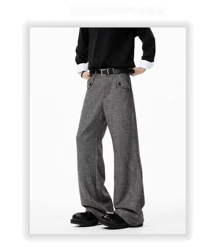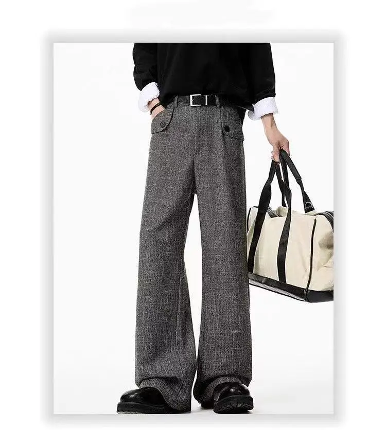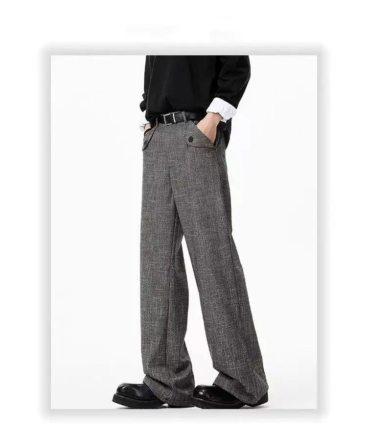 WIAOFELLAS - Grey Straight-leg Casual Pants Men American Streetwear Brand Retro and Stylish Loose Wide-leg Plaid Suit Pants