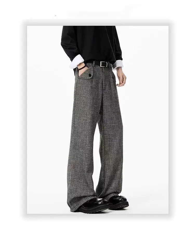 WIAOFELLAS  -  Grey Straight-leg Casual Pants Men American Streetwear Brand Retro and Stylish Loose Wide-leg Plaid Suit Pants