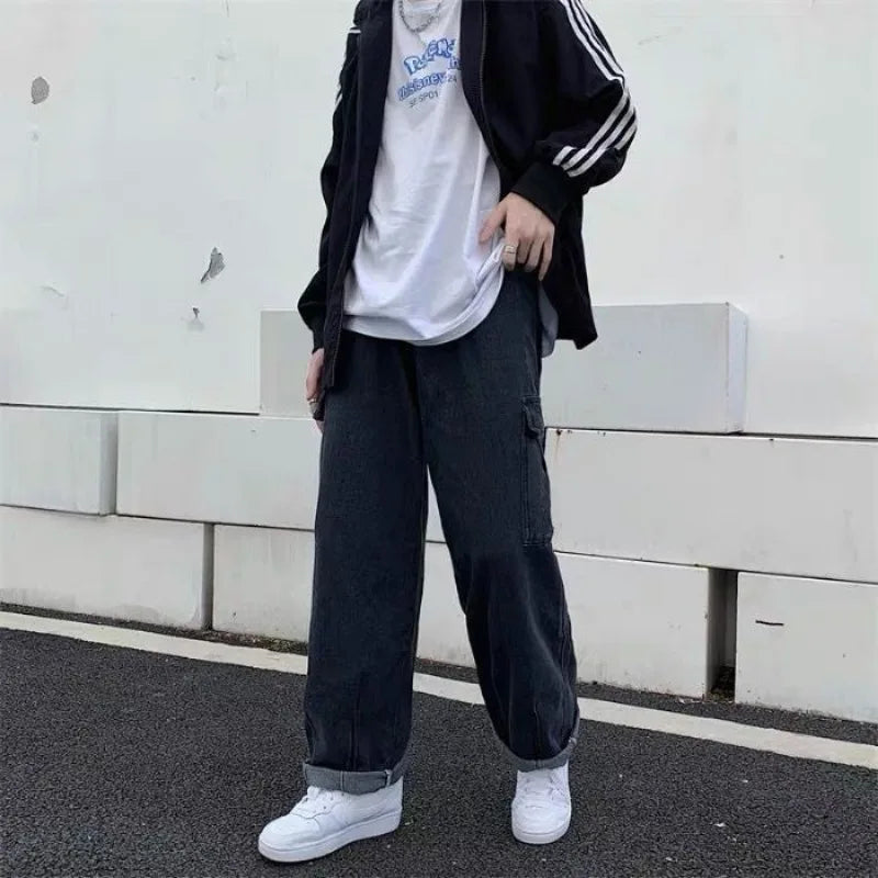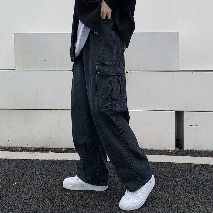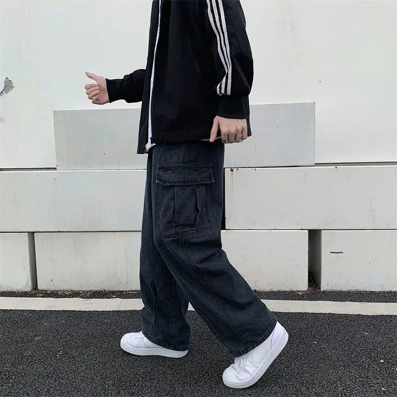 WIAOFELLAS - Korean Fashion Spring Autumn Solid Color Elastic Pockets Trousers Wide Leg Cargo Men's Clothing High Waisted High Street Pants