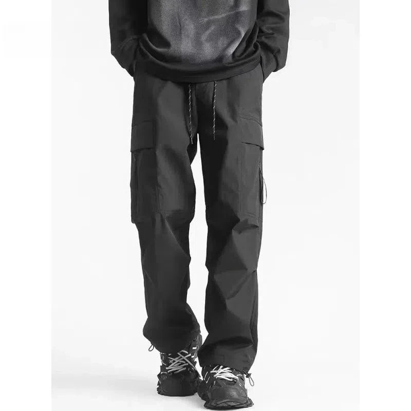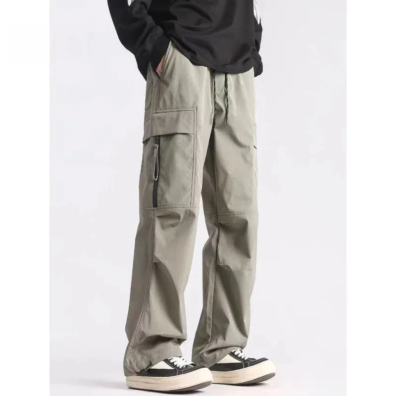 WIAOFELLAS - Korean Fashion Wide Leg Spring Autumn Men's Clothing Solid Color Elastic High Waisted Zipper Pockets Trousers Cargo Pants