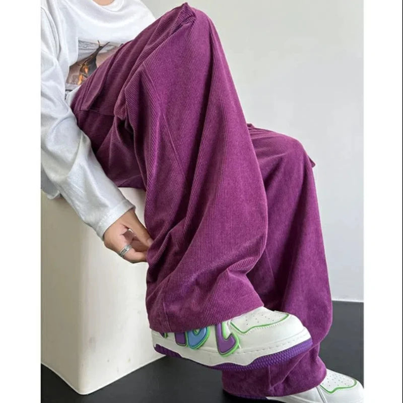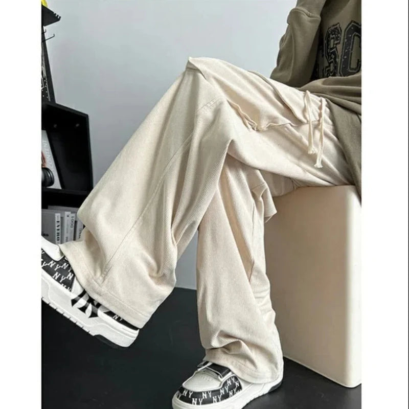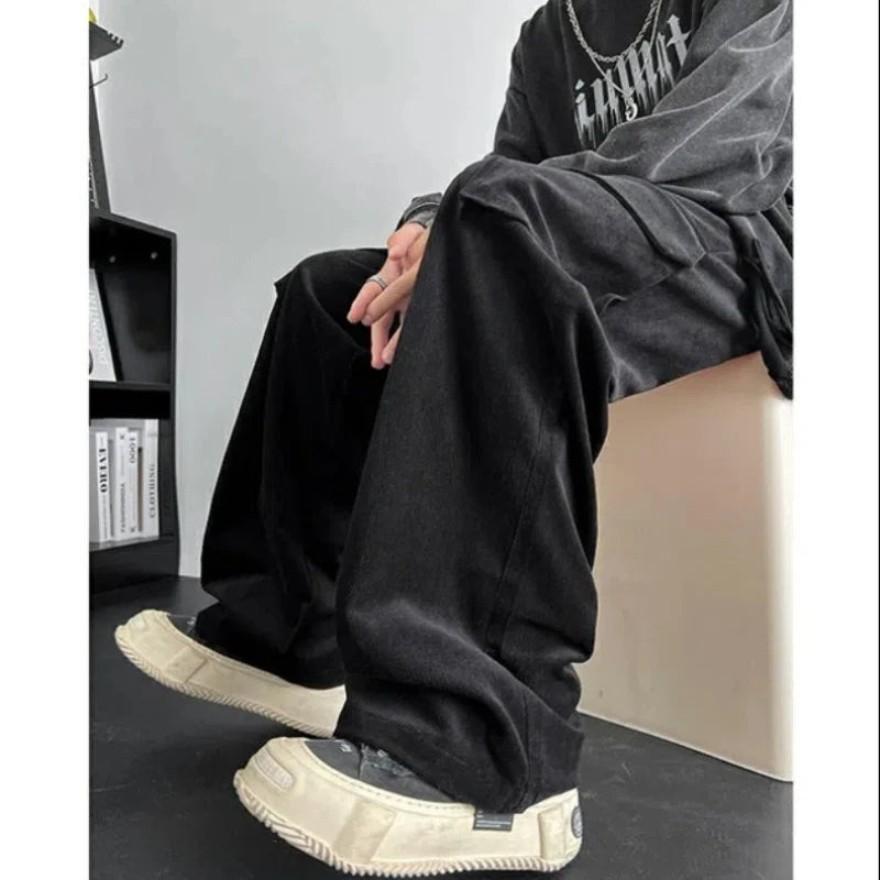 WIAOFELLAS - Korean Fashion Wide Leg Trousers Cargo Solid Color Elastic High Waisted Men's Clothing Spring Autumn Boyfriend Cropped Pants