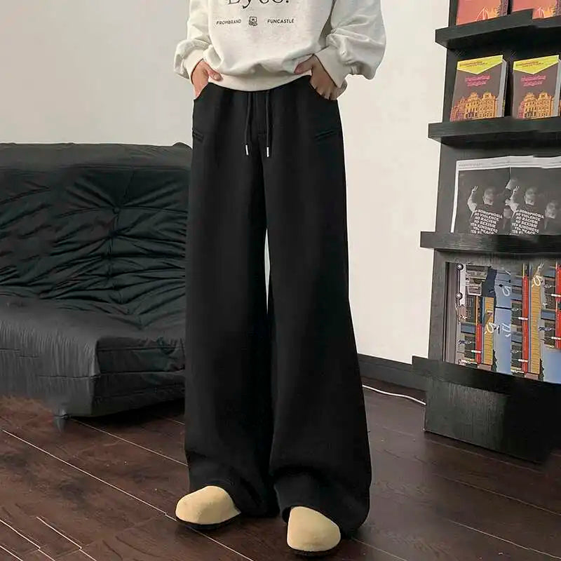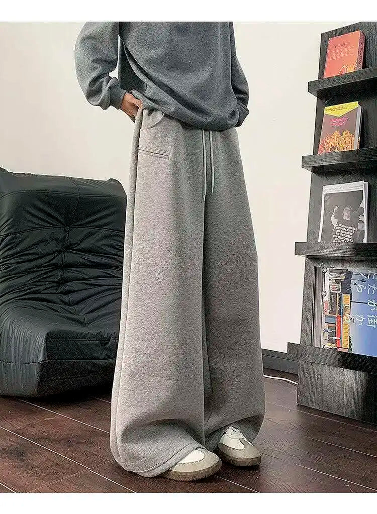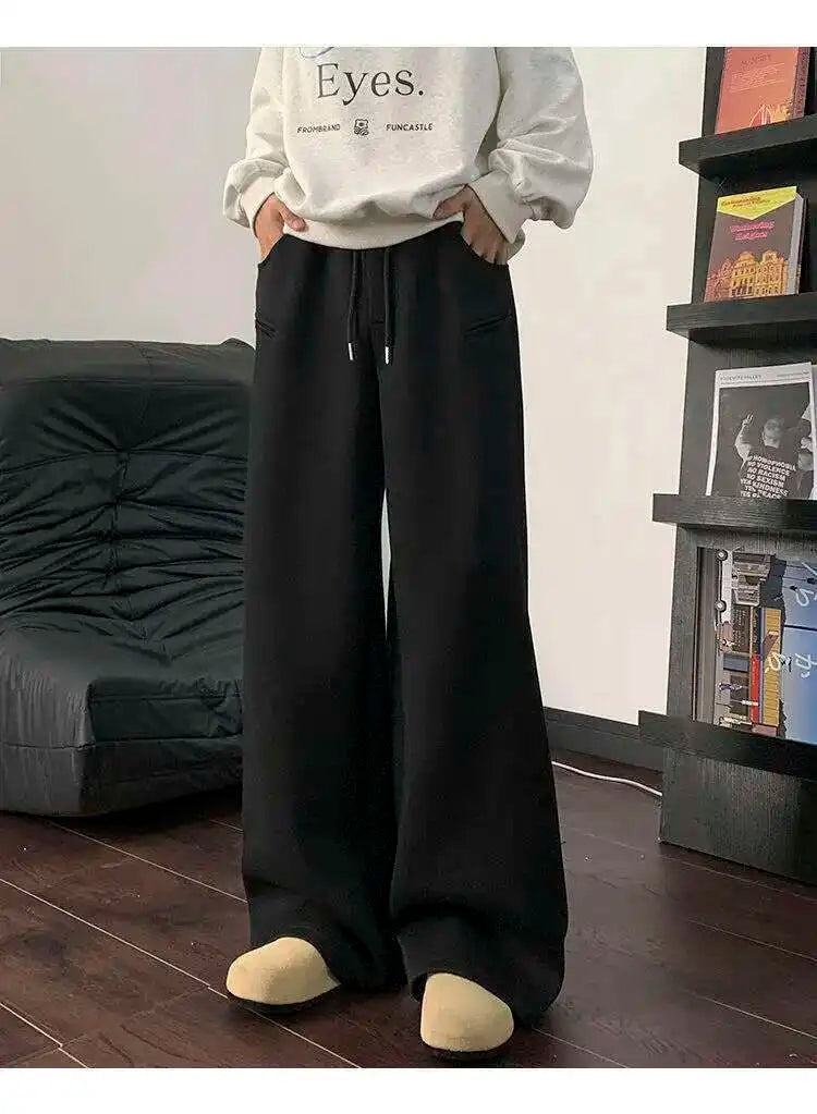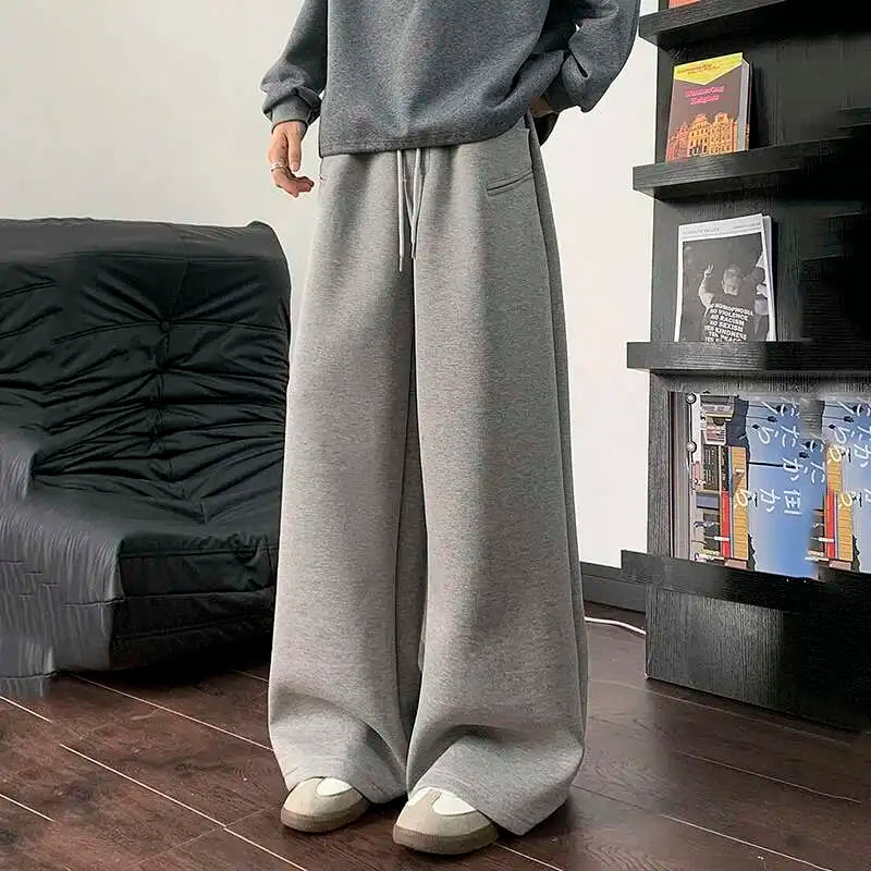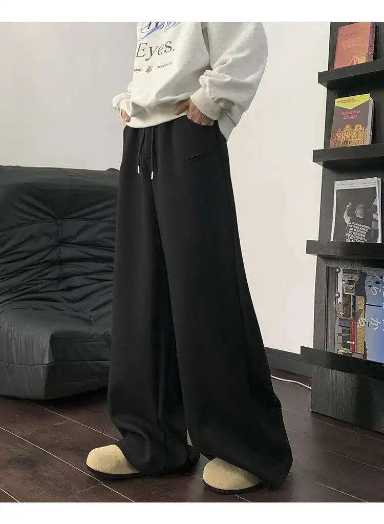 WIAOFELLAS - Koreann Style Men Sweatpants Casual Solid Color Drawstring Straight Fleece Bottom Elastic Waist Wide Leg Male Pants