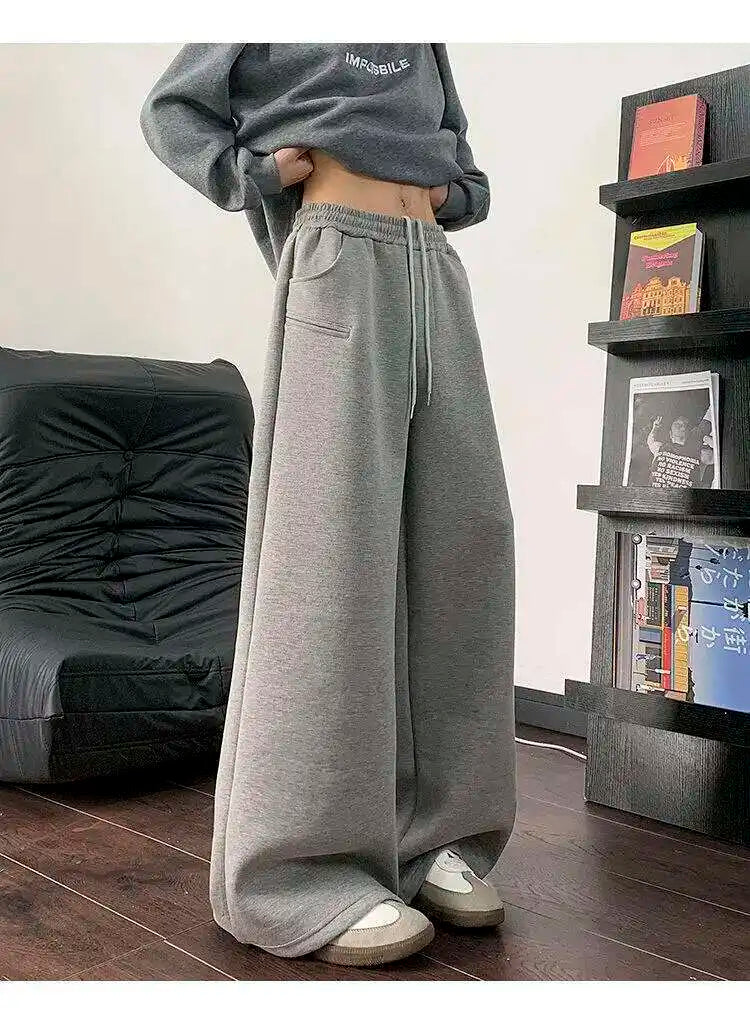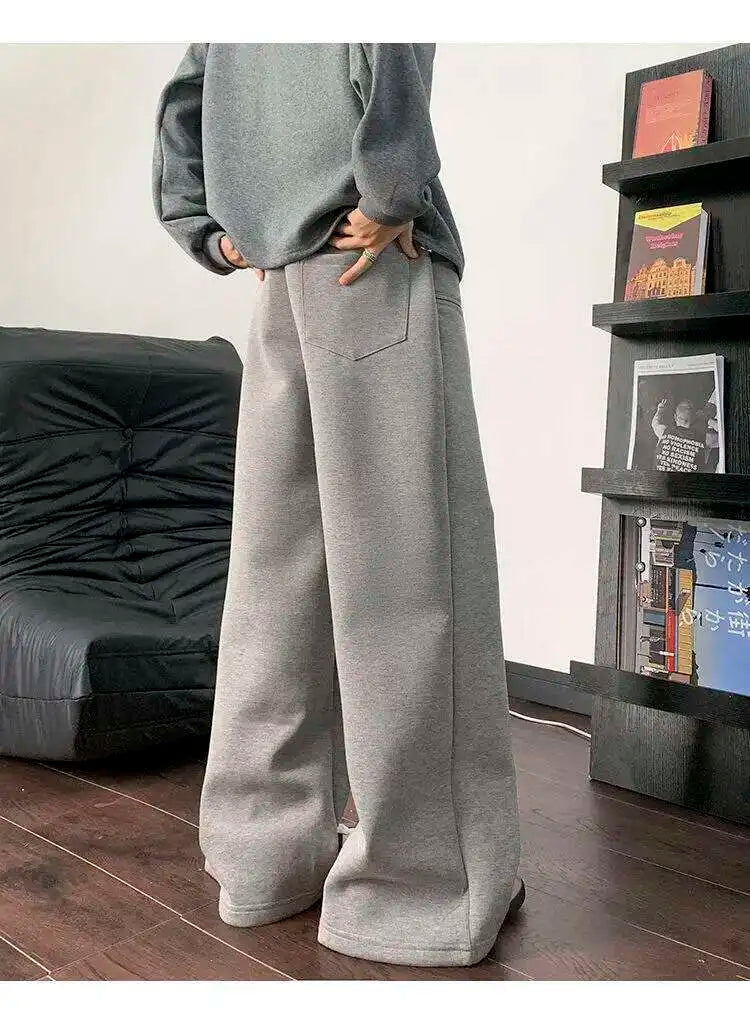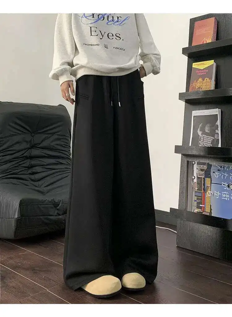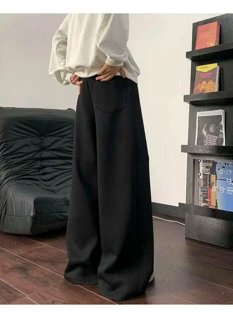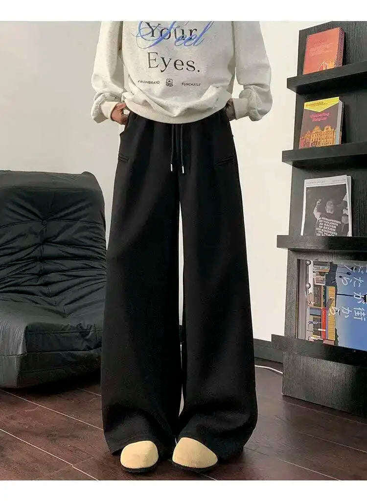 WIAOFELLAS - Koreann Style Men Sweatpants Casual Solid Color Drawstring Straight Fleece Bottom Elastic Waist Wide Leg Male Pants