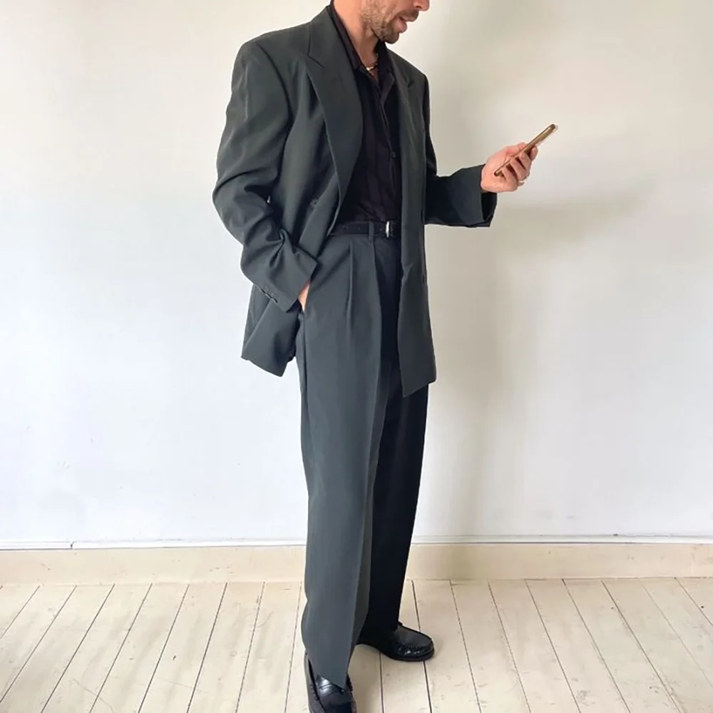 WIAOFELLAS  -  Loose Dark Grey Double Breasted Men Suit Two Pieces(Jacket+Pants) Lapel Outfits Casual Party Prom Wedding Set