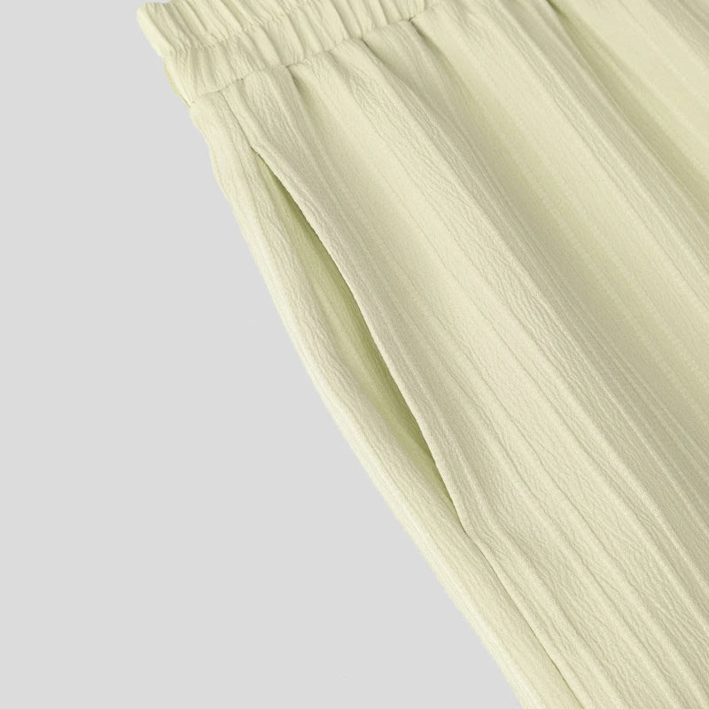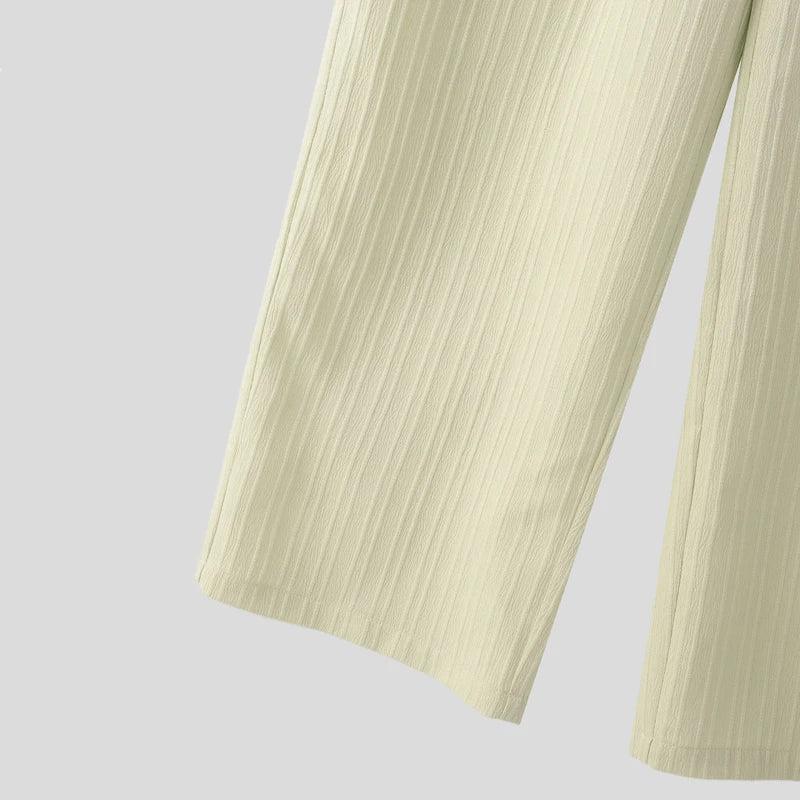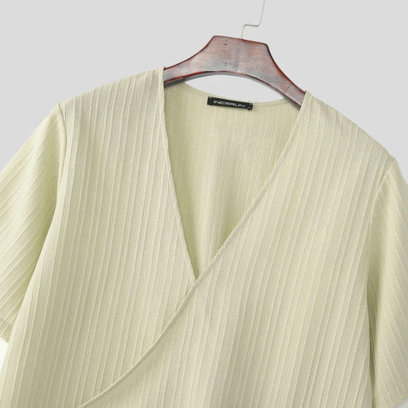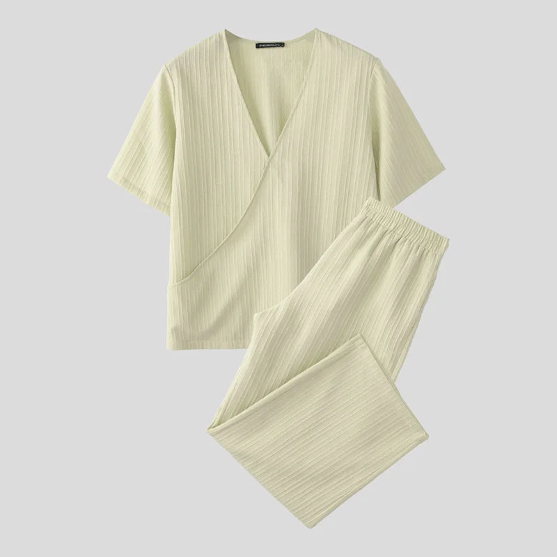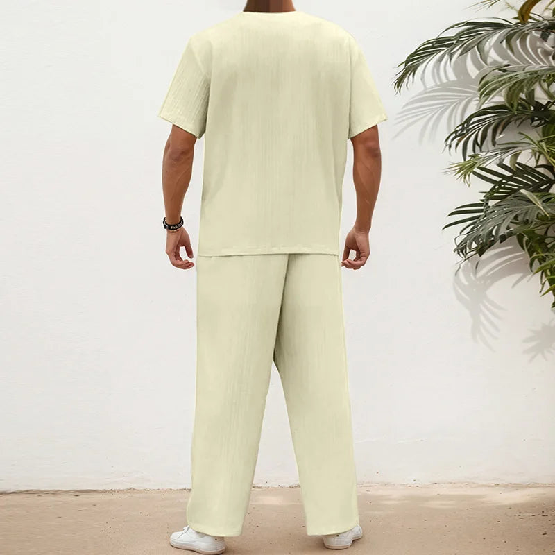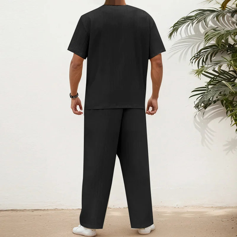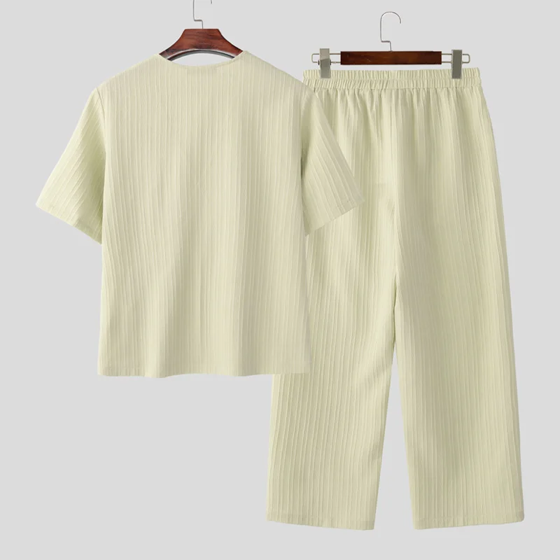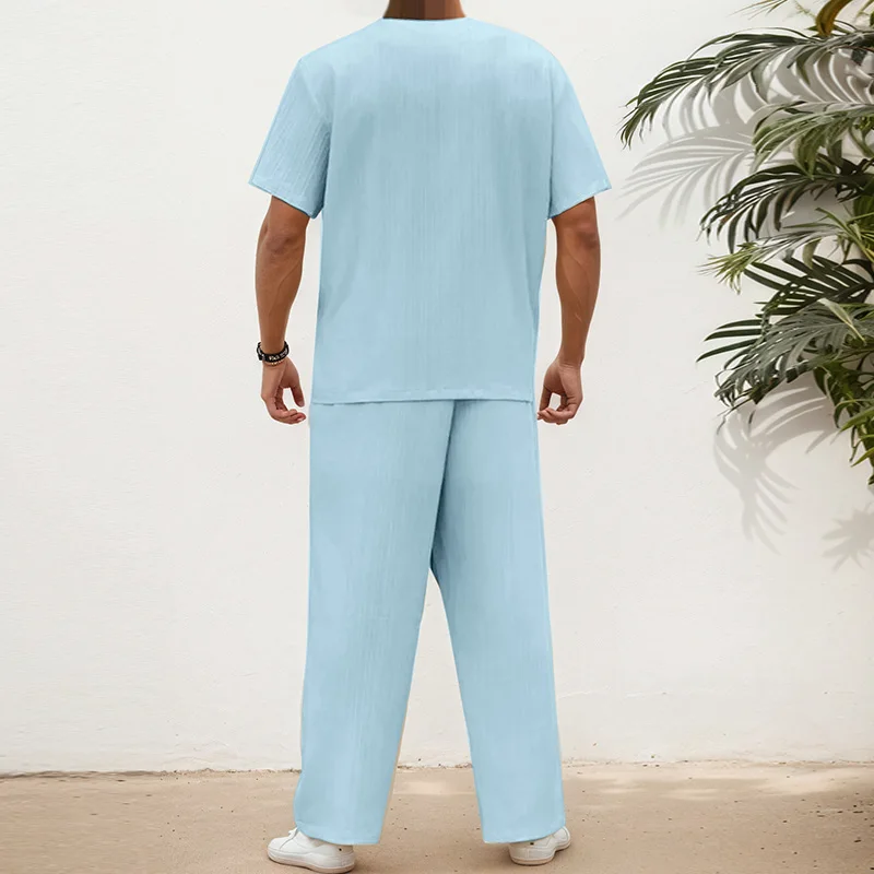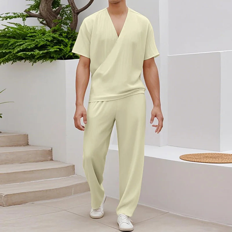 WIAOFELLAS - Men Sets Solid Color V Neck Short Sleeve T Shirt & Pants Two Pieces Sets Summer Streetwear 2025 Loose Fashion Men Suits