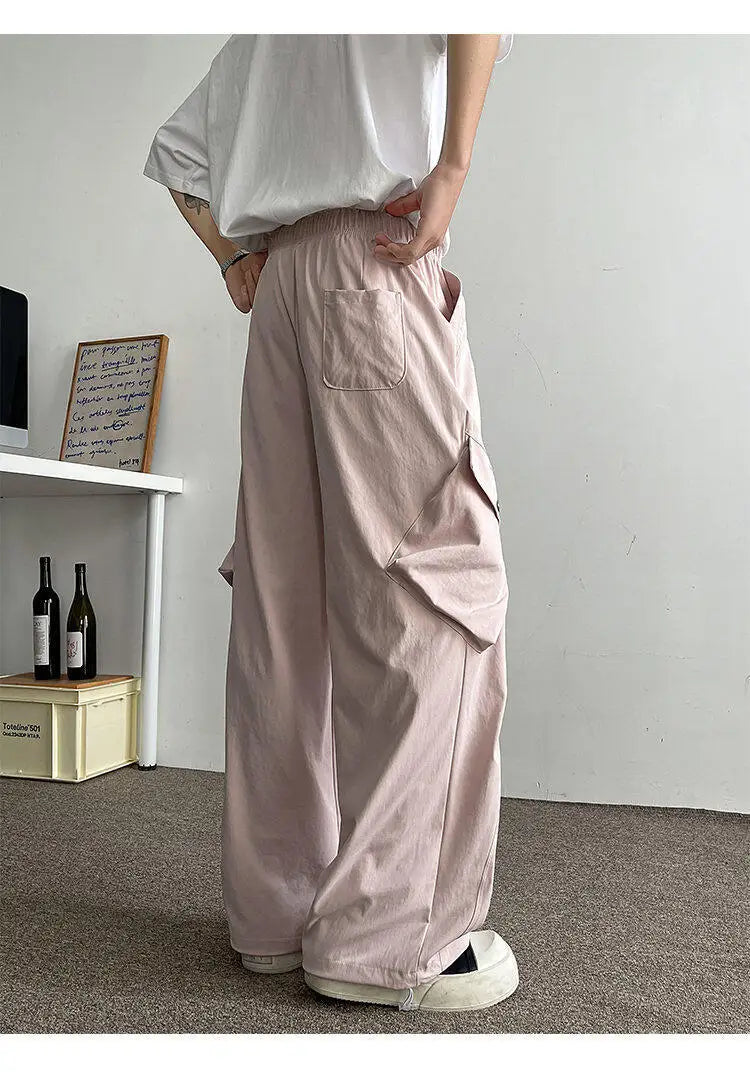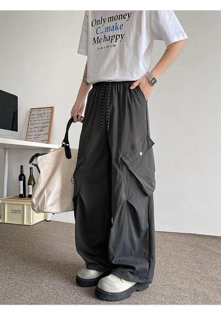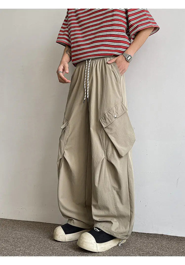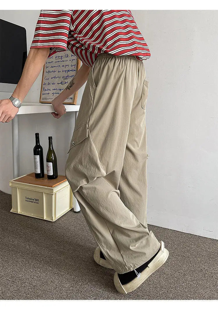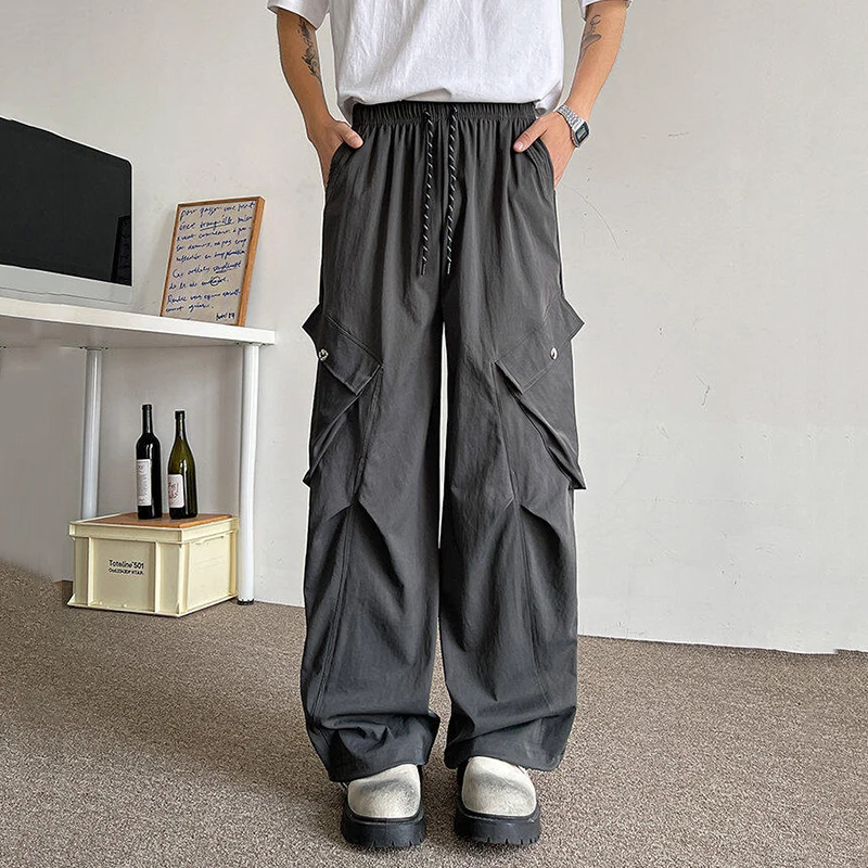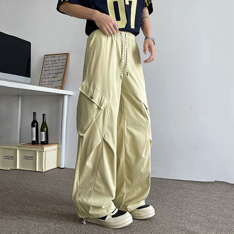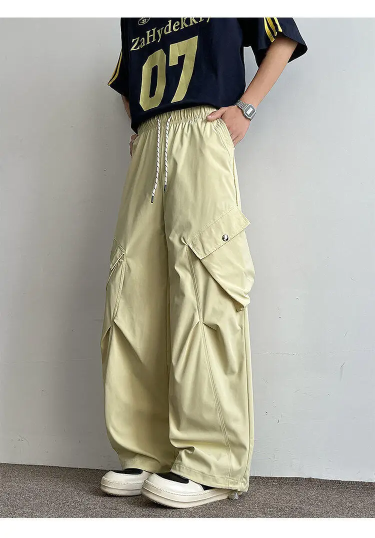 WIAOFELLAS  -  Men's Casual Pants Drawstring Solid Color Pleated Design Menswear Side Big Pokcets Elastic Waist Male Trousers New