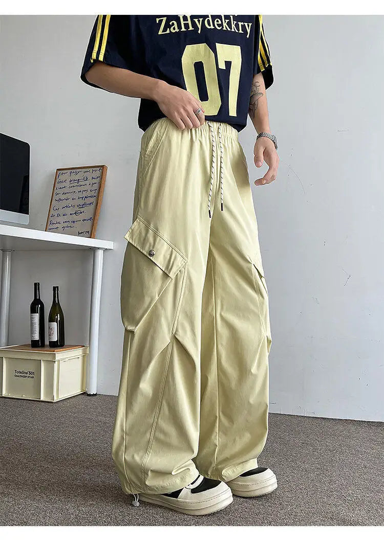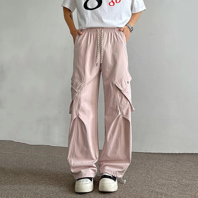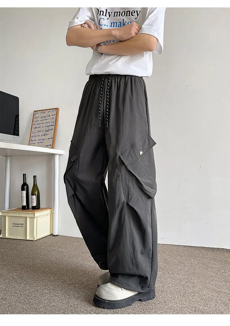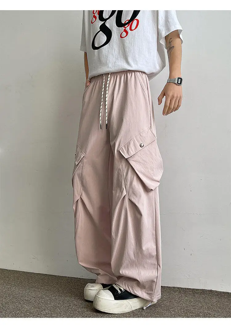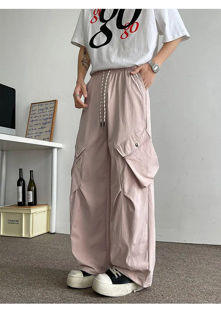 WIAOFELLAS - Men's Casual Pants Drawstring Solid Color Pleated Design Menswear Side Big Pokcets Elastic Waist Male Trousers New