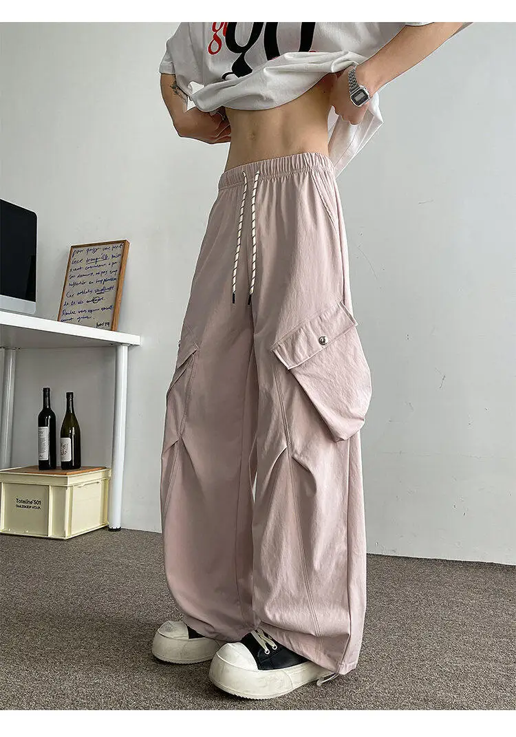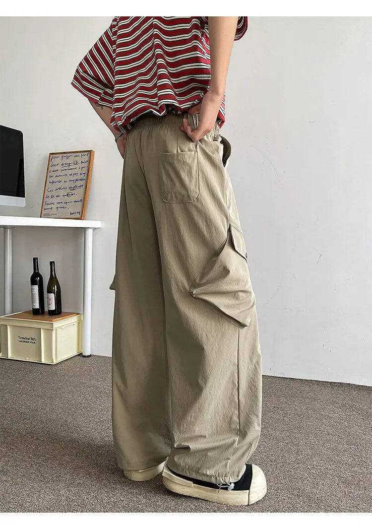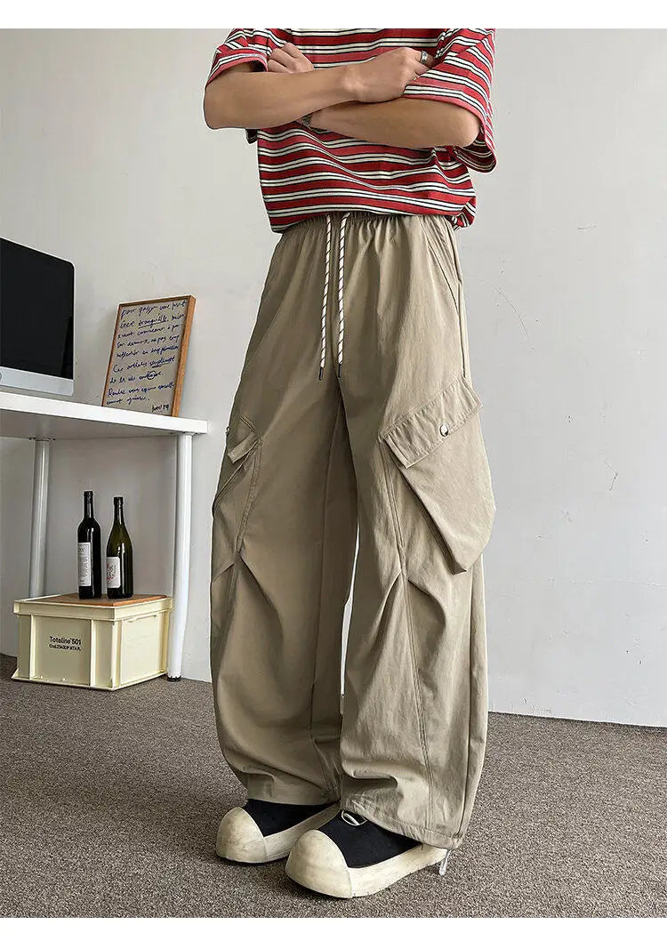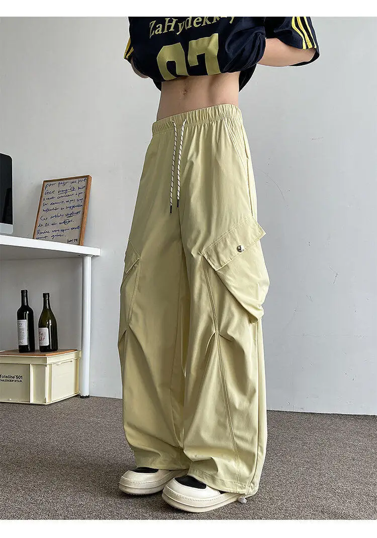 WIAOFELLAS - Men's Casual Pants Drawstring Solid Color Pleated Design Menswear Side Big Pokcets Elastic Waist Male Trousers New