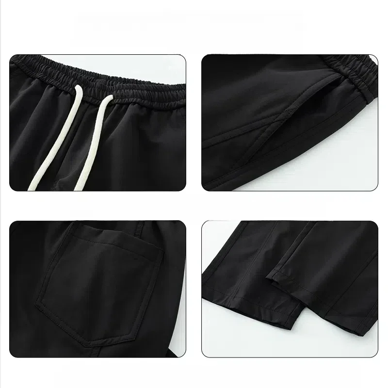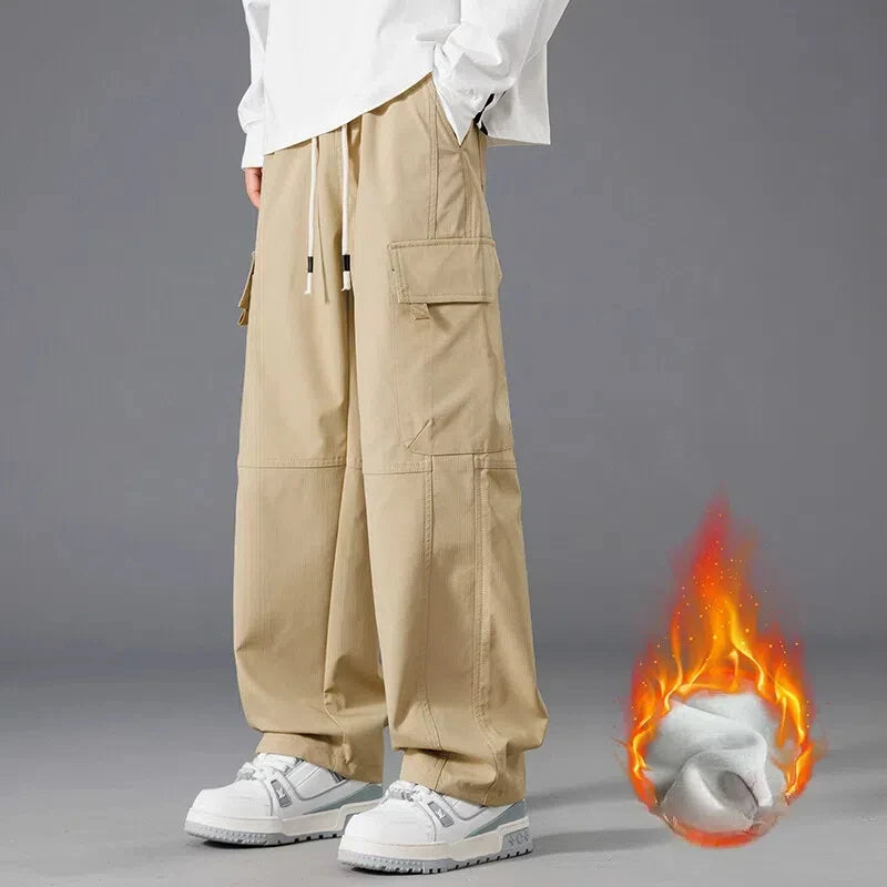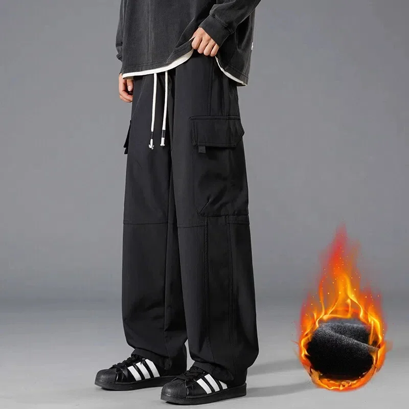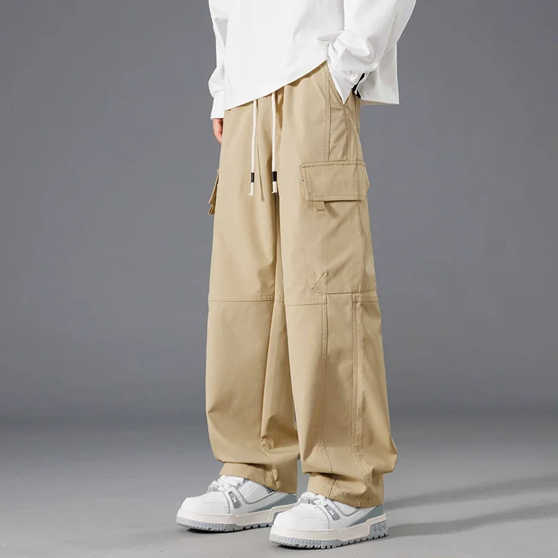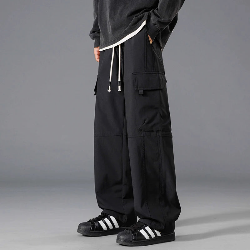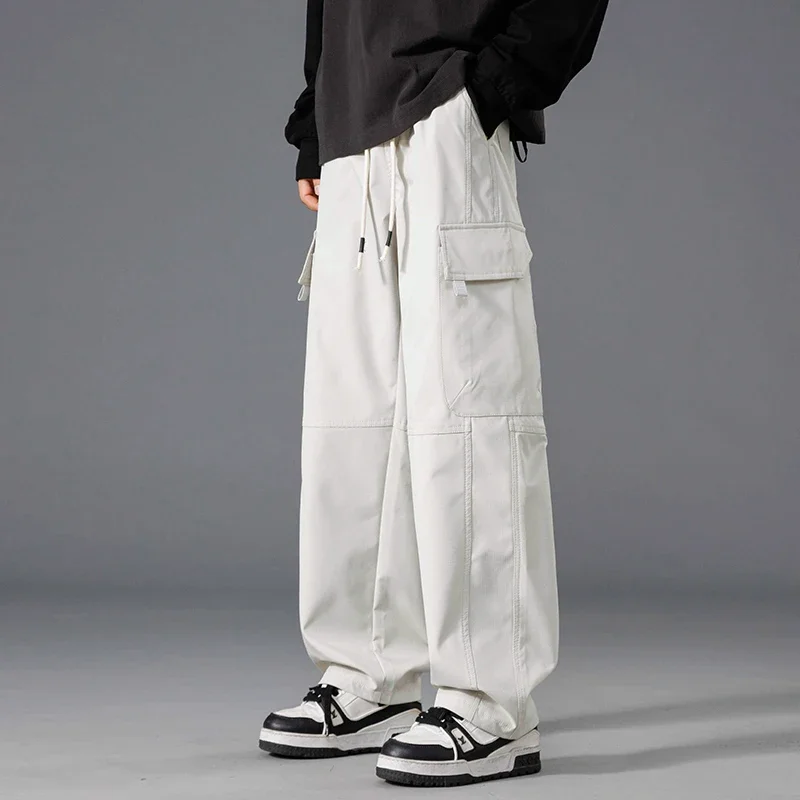 WIAOFELLAS - Men's Clothing Elastic Cargo Straight Trousers Solid Color High Waist Pockets Spring Autumn Drawstring Casual Loose Pants