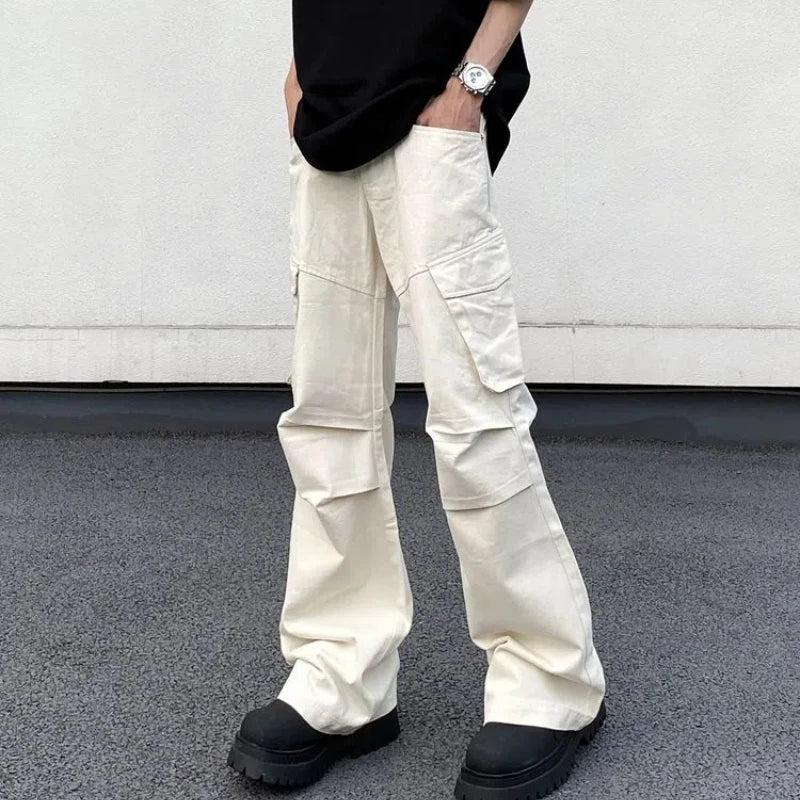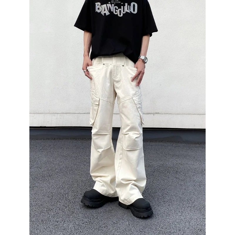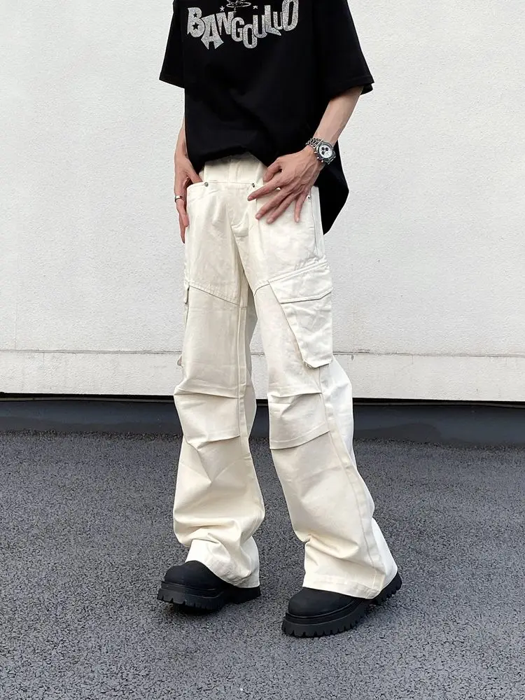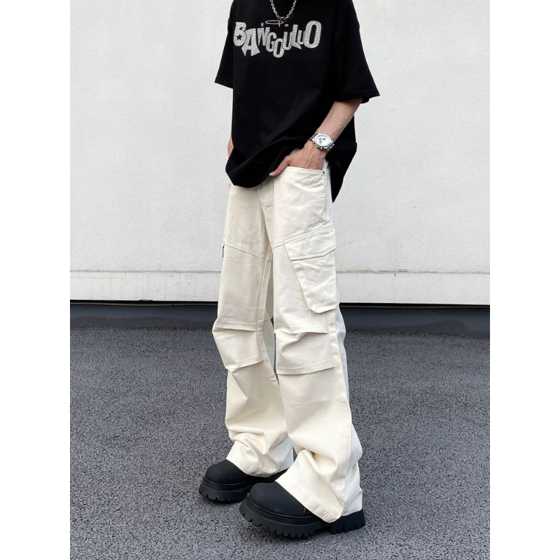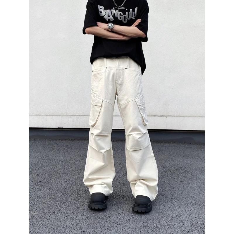 WIAOFELLAS - Men's Clothing Elastic Solid Color Zipper Pockets High Waisted Casual Trousers Straight Spring Autumn Wide Leg Cropped Pants