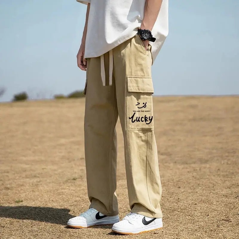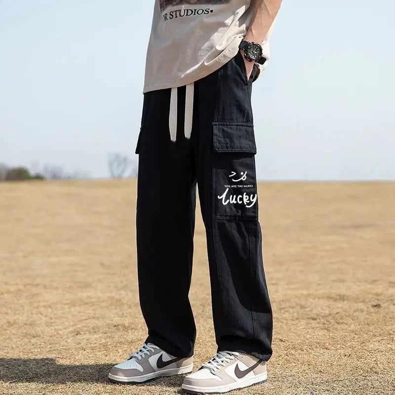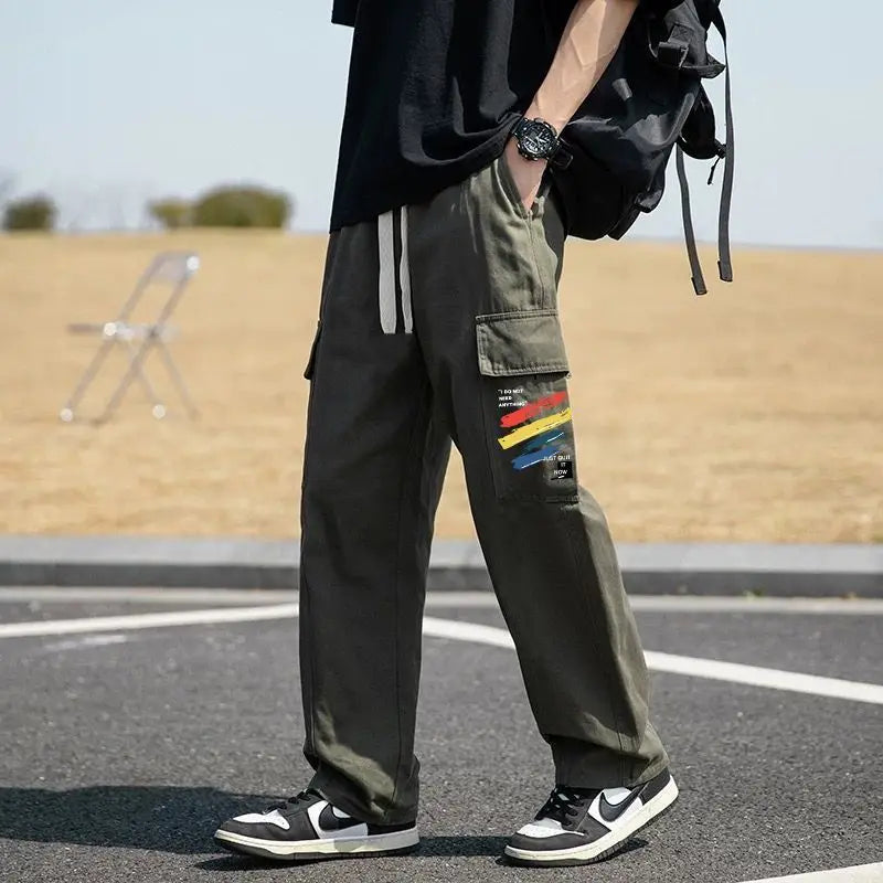 WIAOFELLAS - Men's Clothing Spring Autumn Elastic Pockets High Waisted Letter Embroidered Casual Trousers Cargo Straight Bloomers Pants