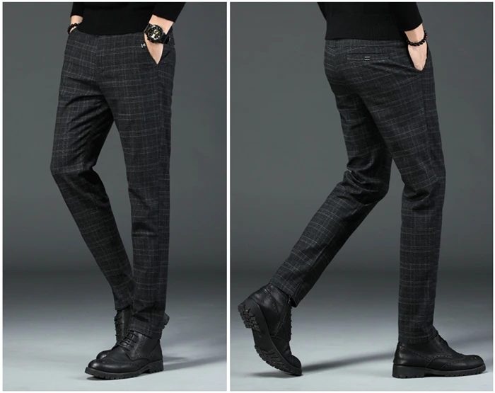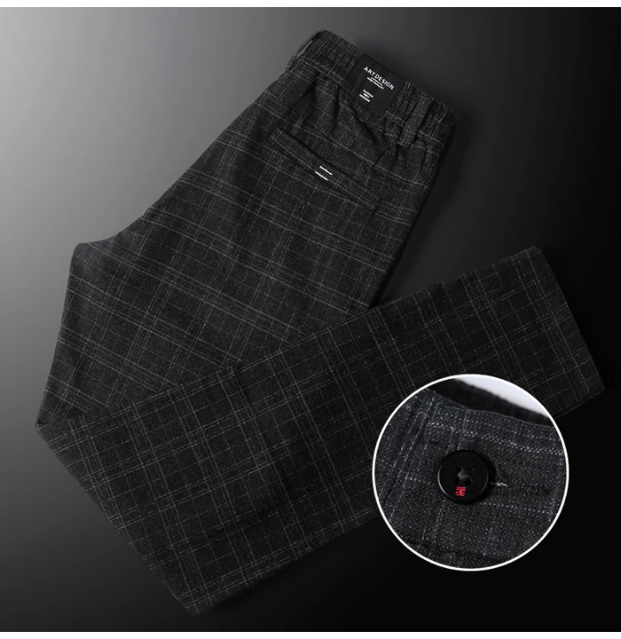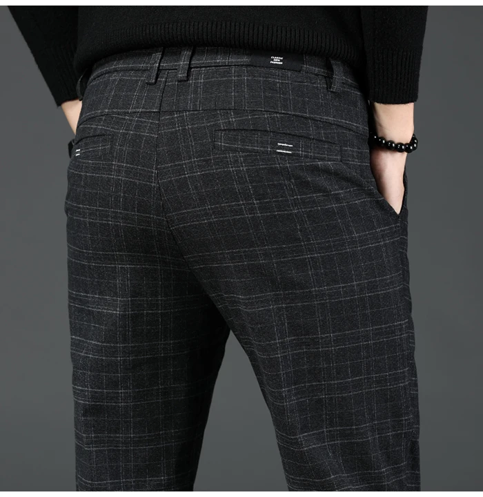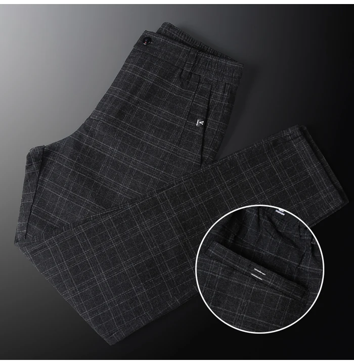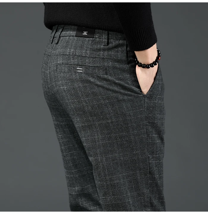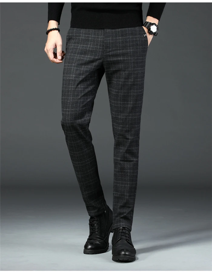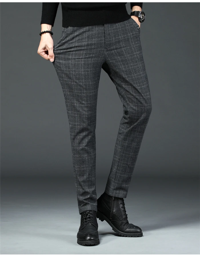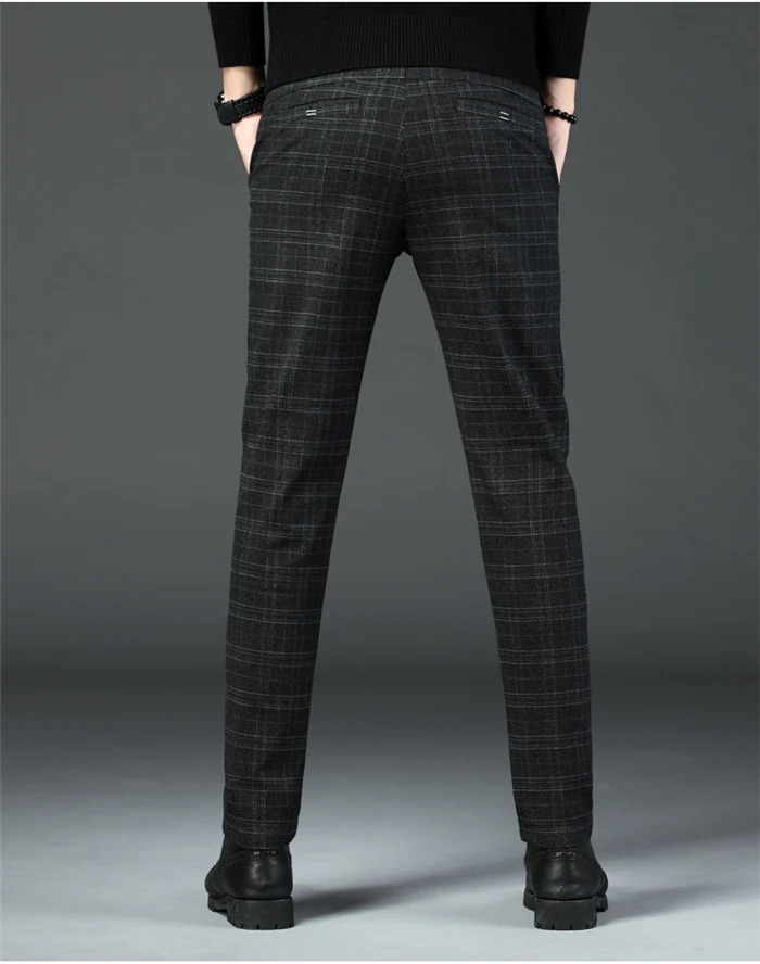 Wiaofellas - New Mens Casual Plaid Pants Business Slim Fit Dark Grey Classic Style Elastic Trousers Male Brand Clothes Street Leisure Fashion