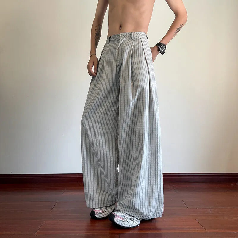 WIAOFELLAS - Plaid Design Men's Casual Pants Korean Style Pleated Quick-dry Bottom Drawstring Straight Wide Leg Male Trousers