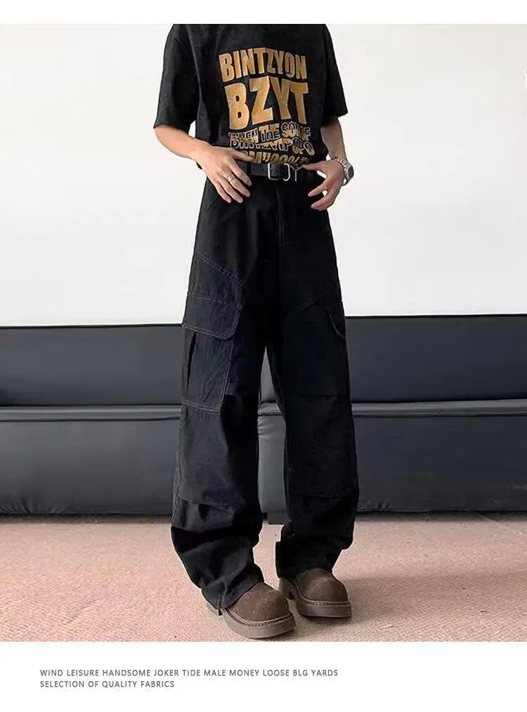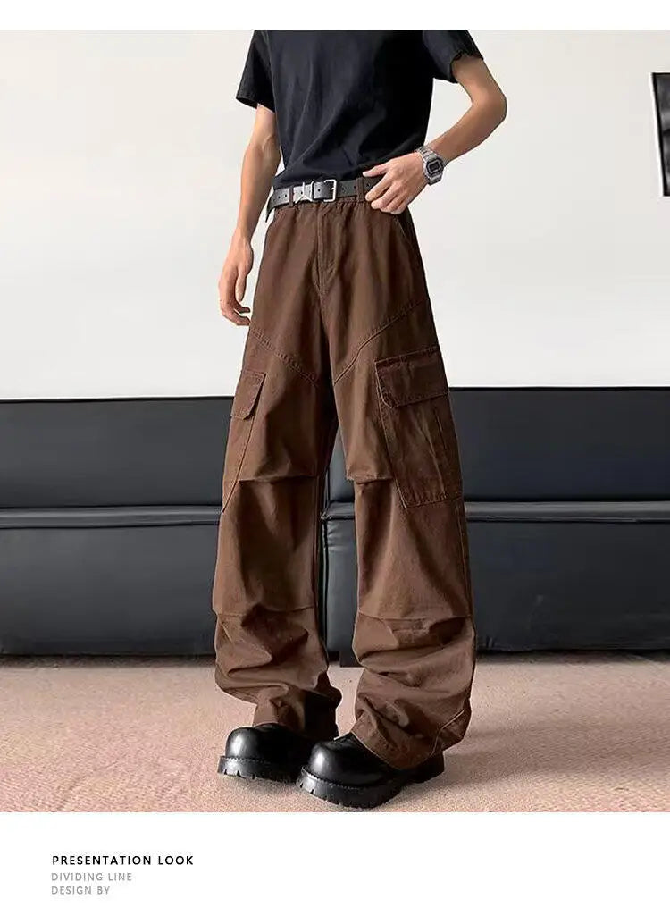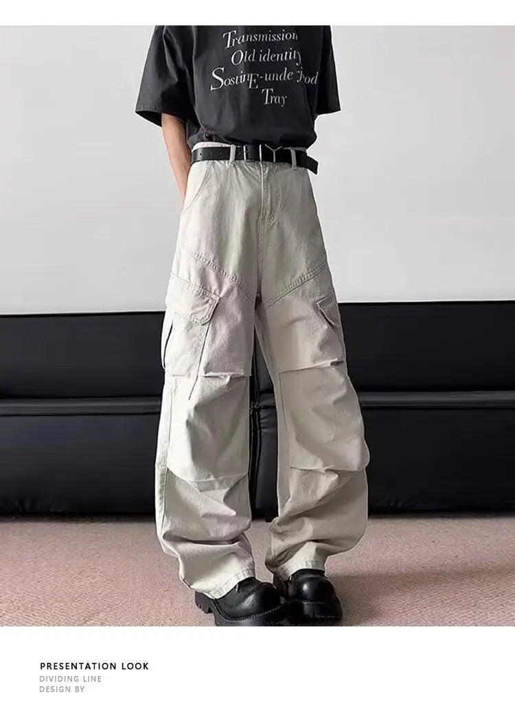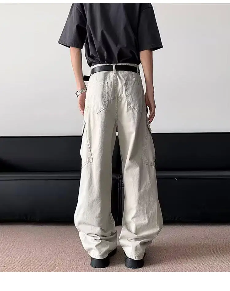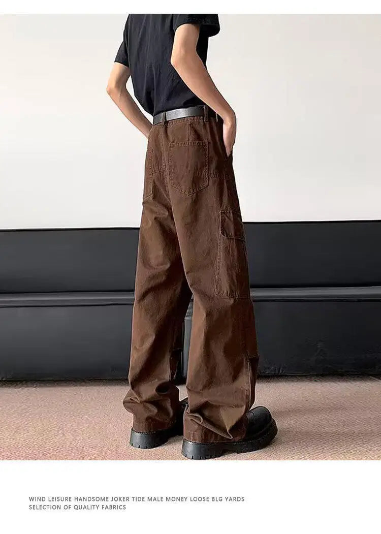 WIAOFELLAS - Pleated Design Men's Casual Pants Side Pocket Solid Color Wide Leg Trousers Loose Straight Male Bottom Functional