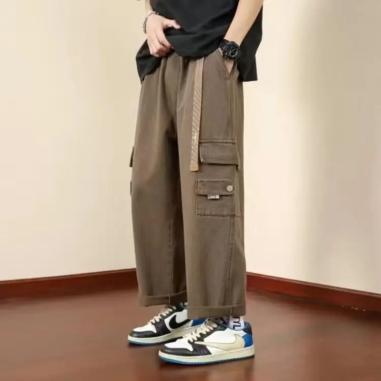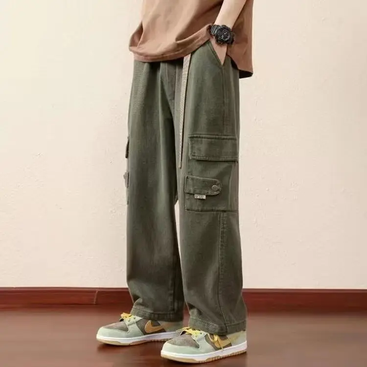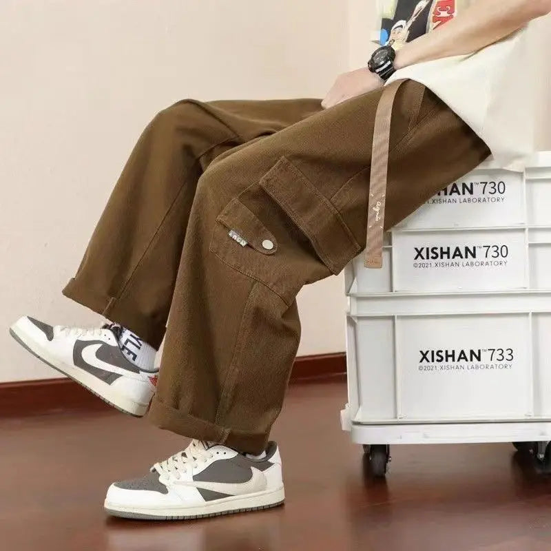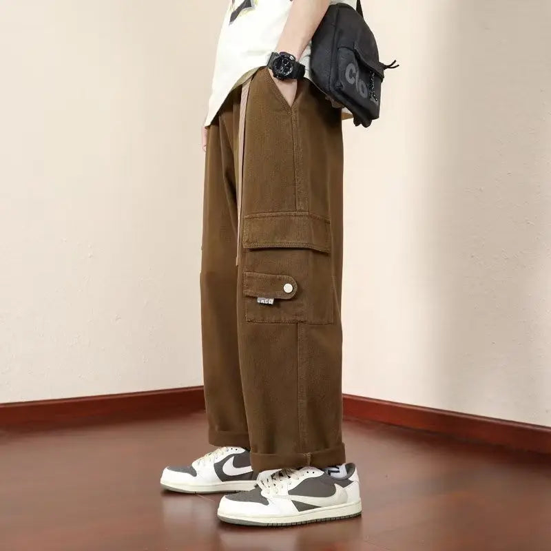 WIAOFELLAS - Preppy Style Solid Color Men's Clothing Spring Autumn Elastic Pockets High Waisted Casual Trousers Cargo Straight Bloomers Pants