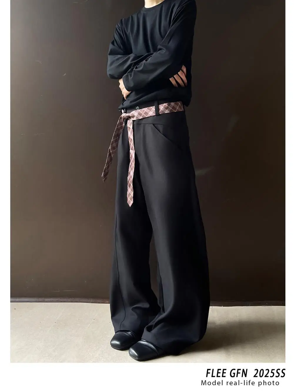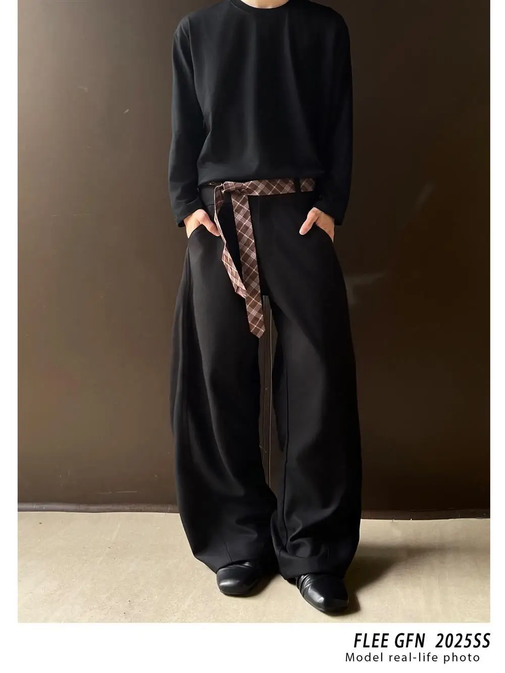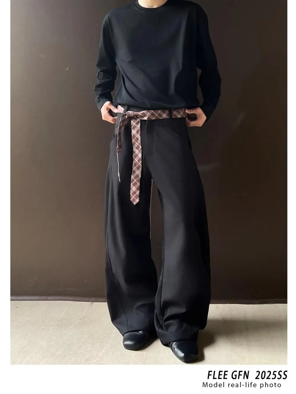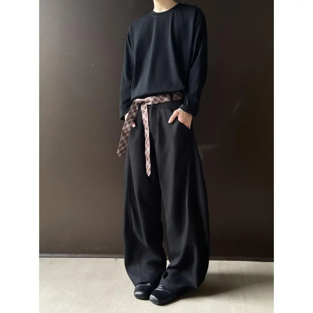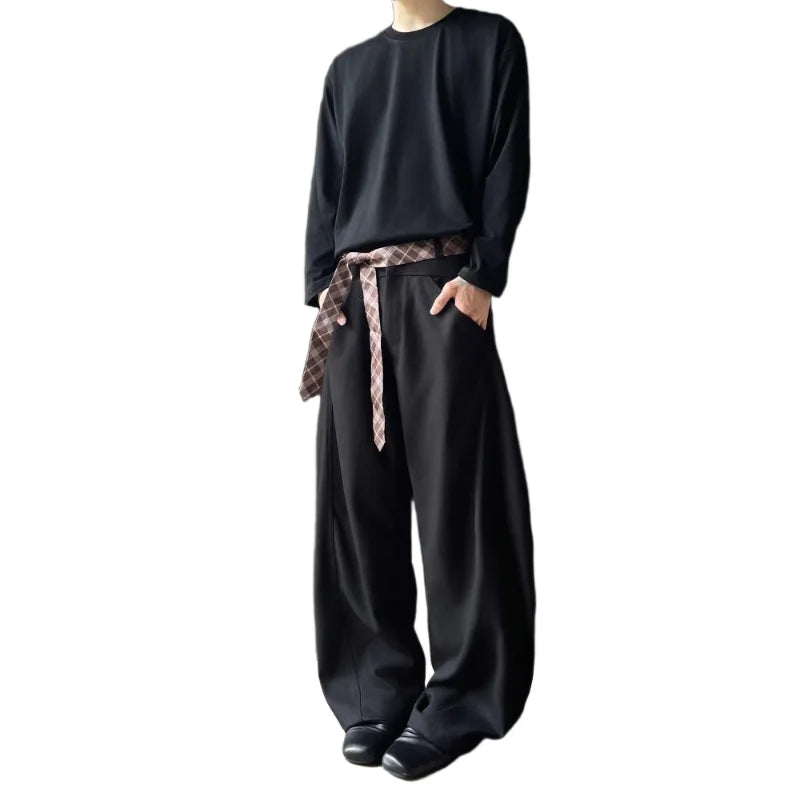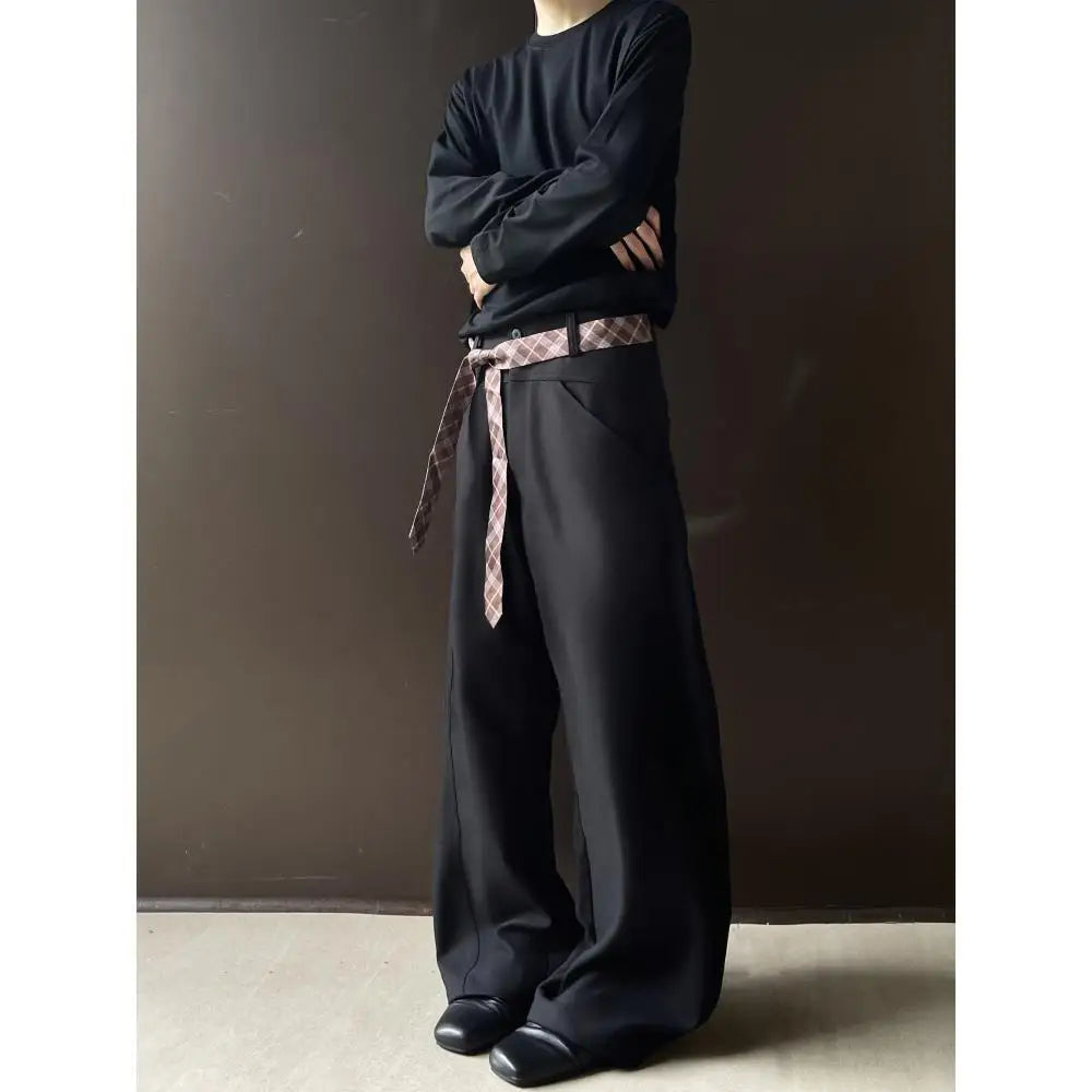 WIAOFELLAS - Retro cleanfit plaid belt design sense scimitar trousers men's casual pants high-end wide-leg drooping western men
