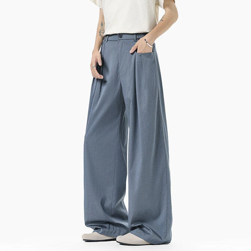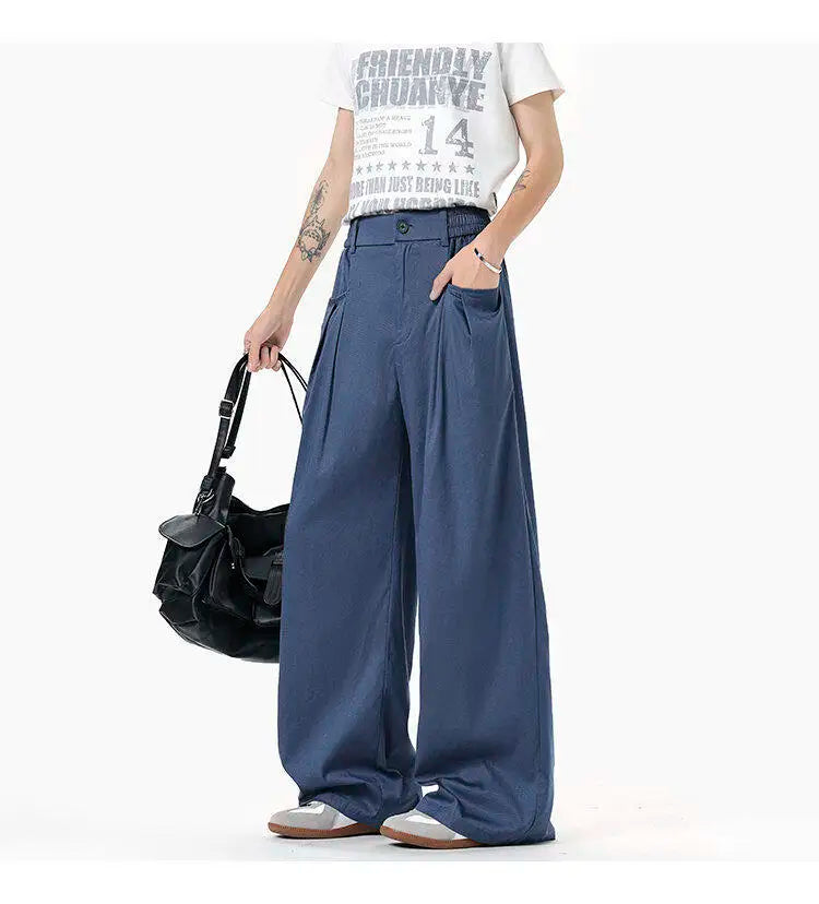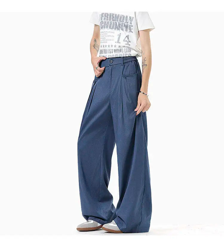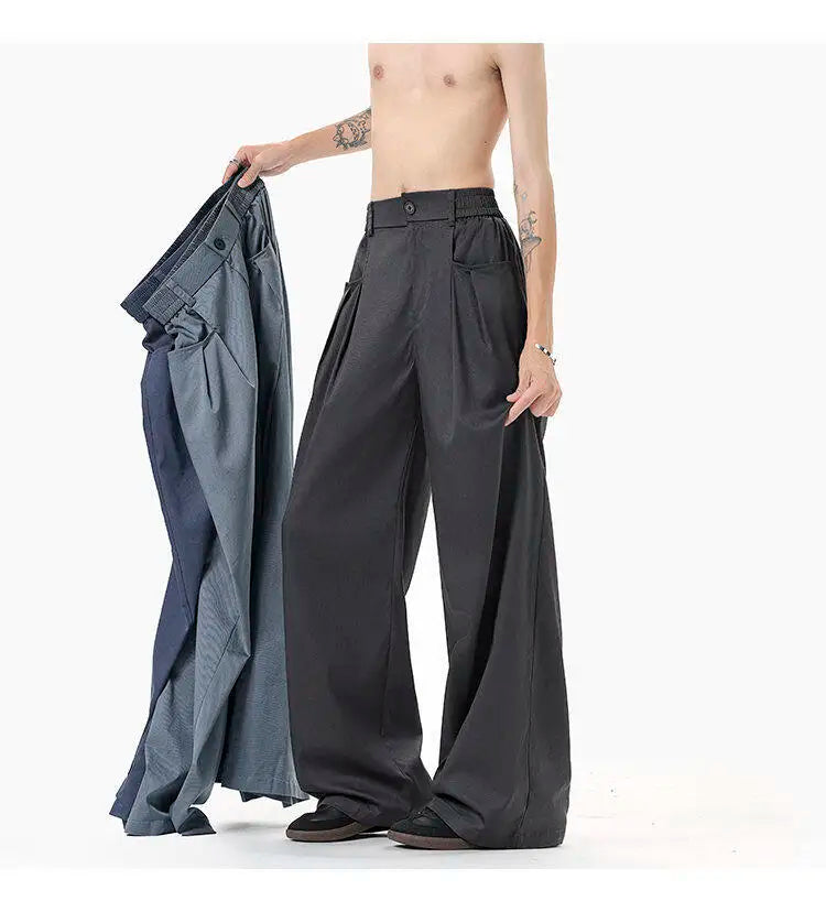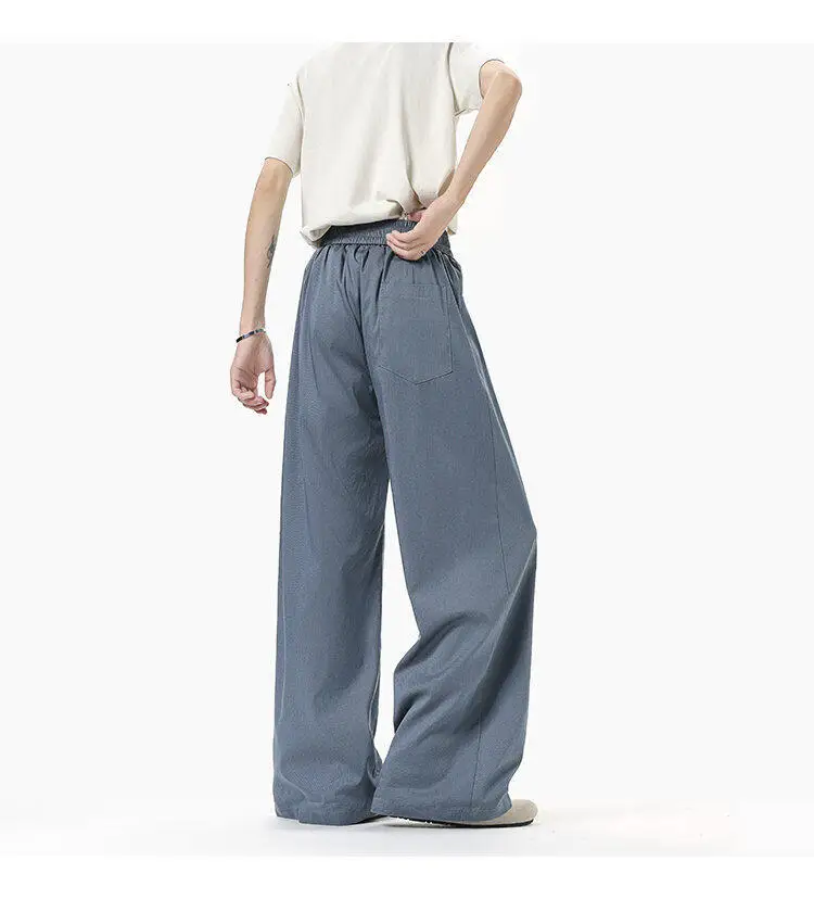 WIAOFELLAS - simple men's casual trousers pleated design new solid color wide leg bottom loose straight thin male pants summer