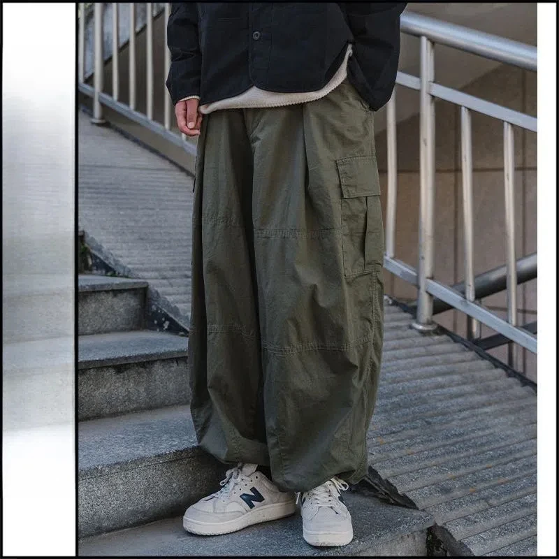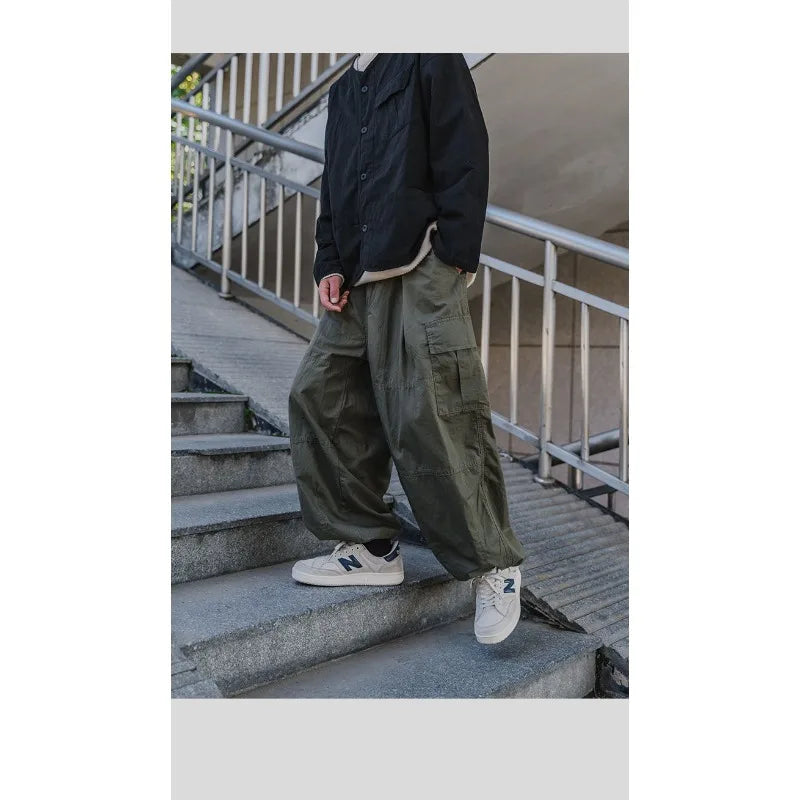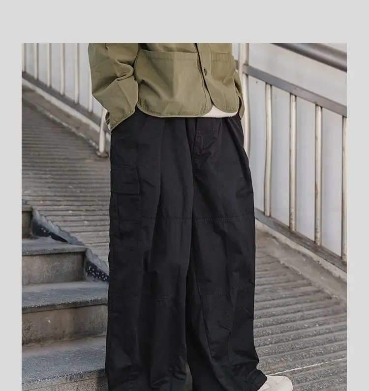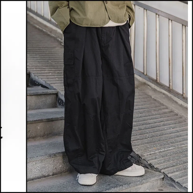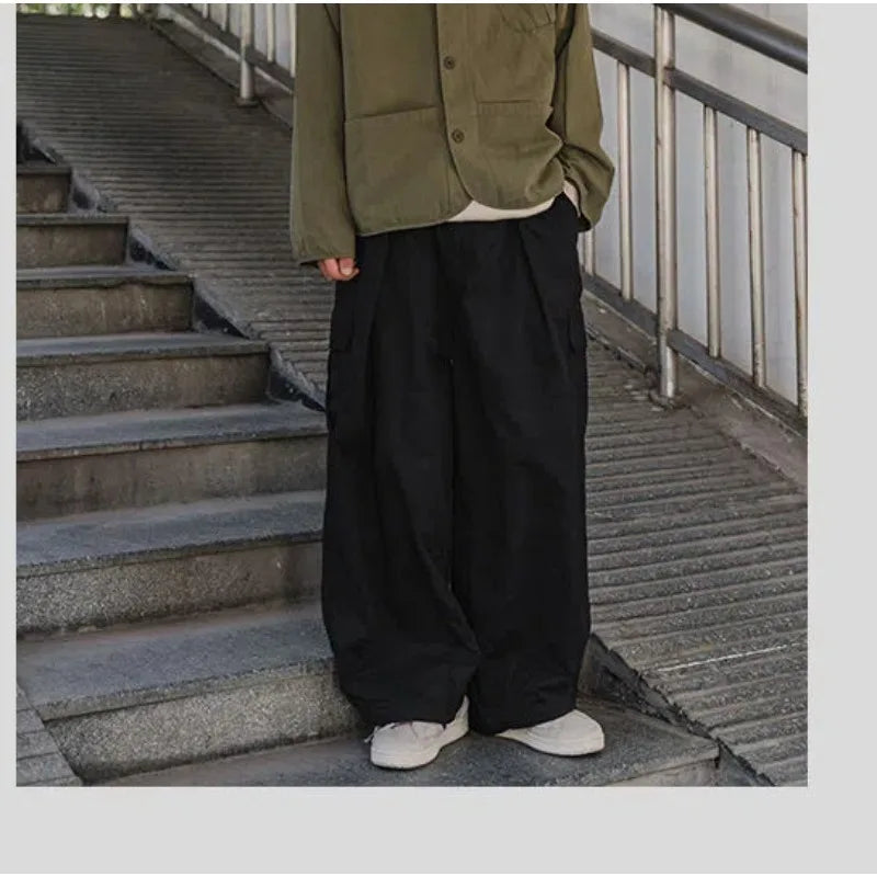 WIAOFELLAS - Spring Autumn Men's Clothing Solid Color Elastic Pockets High Waist Casual Loose Fashionable Trousers Cargo Wide Leg Pants