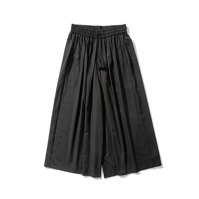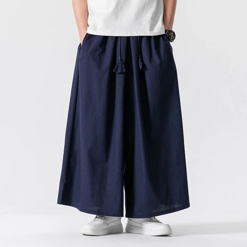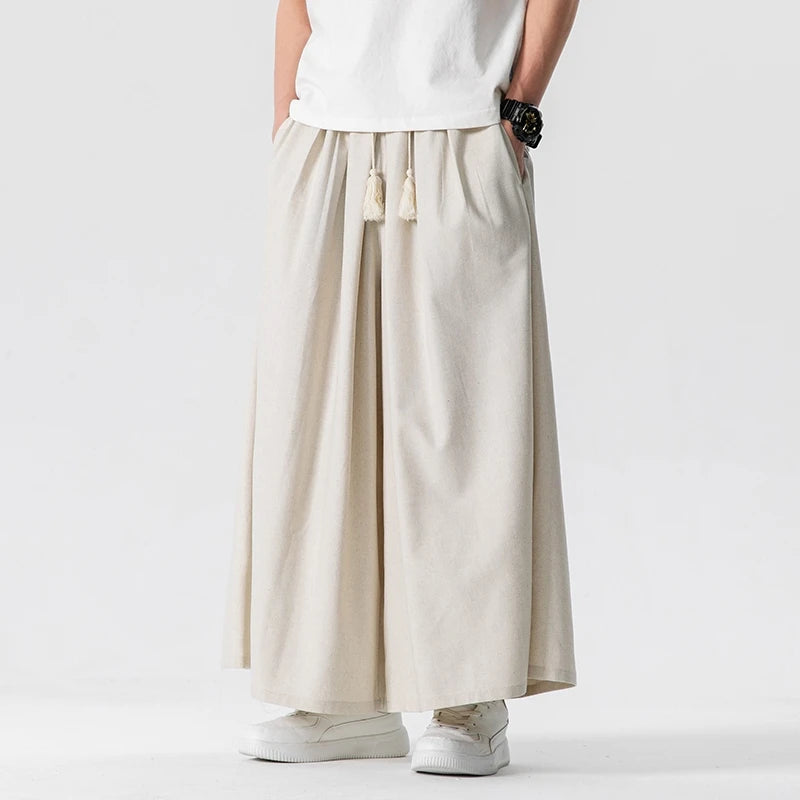 WIAOFELLAS - Summer Chinese Style Wide Leg Pants Men Loose Joggers Trousers Male Linen Straight Elastic Waist Hip Hop Full Length Pants