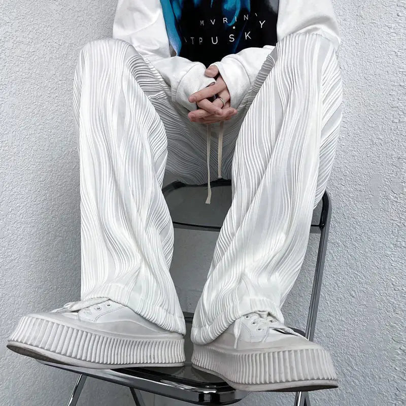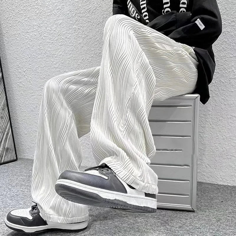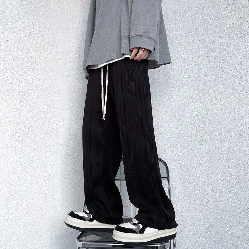WIAOFELLAS - Summer Korean Fashion Simple Ice Silk Wide Leg Pants Men Solid Elastic Waist Pockets Thin High Street Loose Straight Trousers