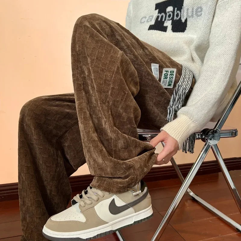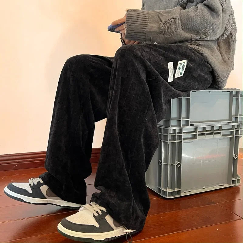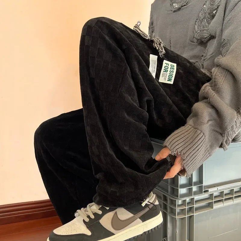 WIAOFELLAS  -  Wide Leg Pants Men Autumn Winter Corduroy Chic Plaid Loose All-match Male Clothing Drawstring Streetwear American Hip Hop Design