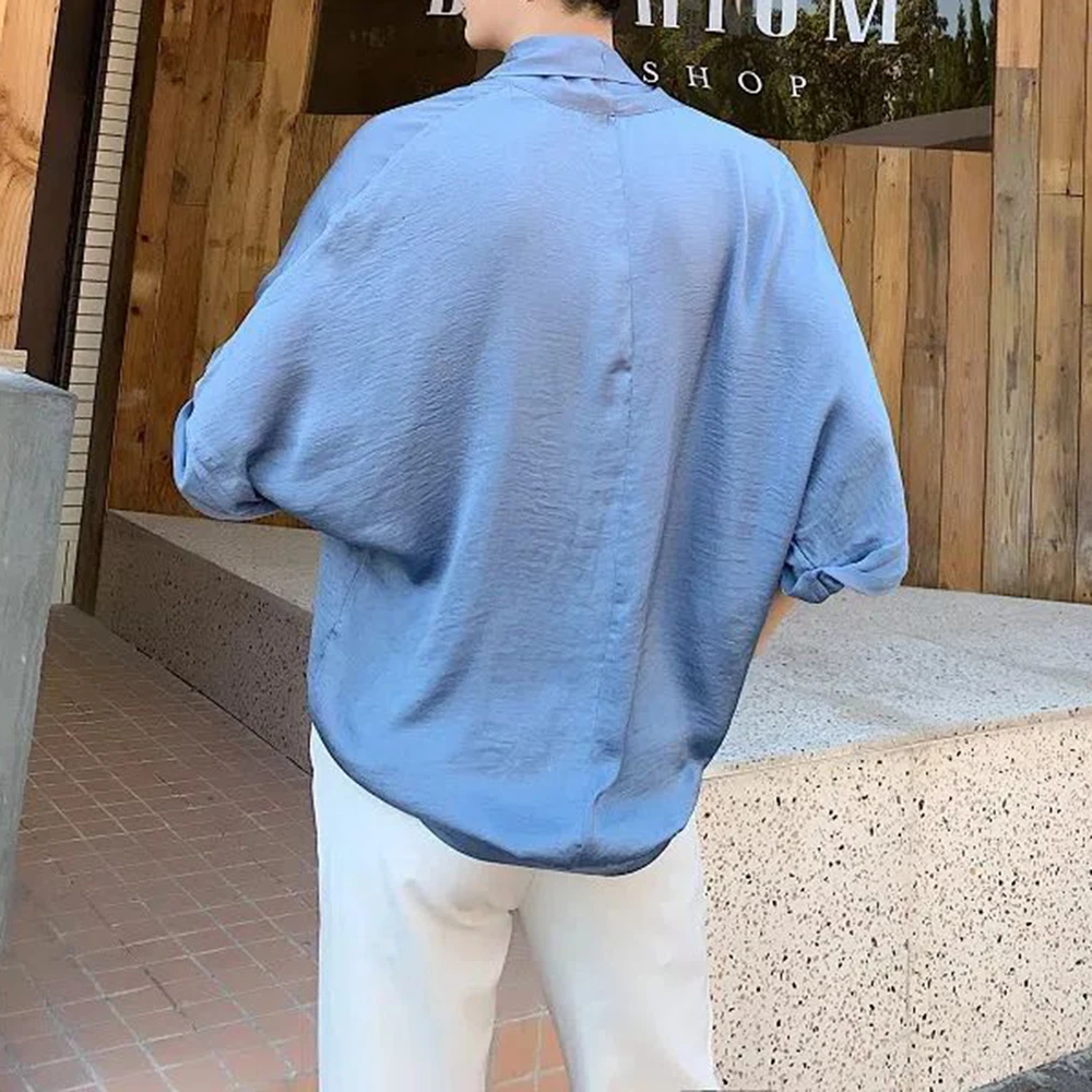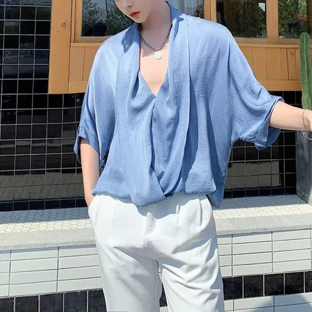Wiaofellas Korean Version of Half-sleeved Satin Design Pullover V-neck Shirt Summer New Trendy Men's Beach Casual Holiday Lazy Style Tops