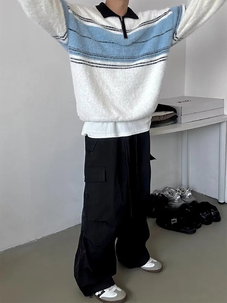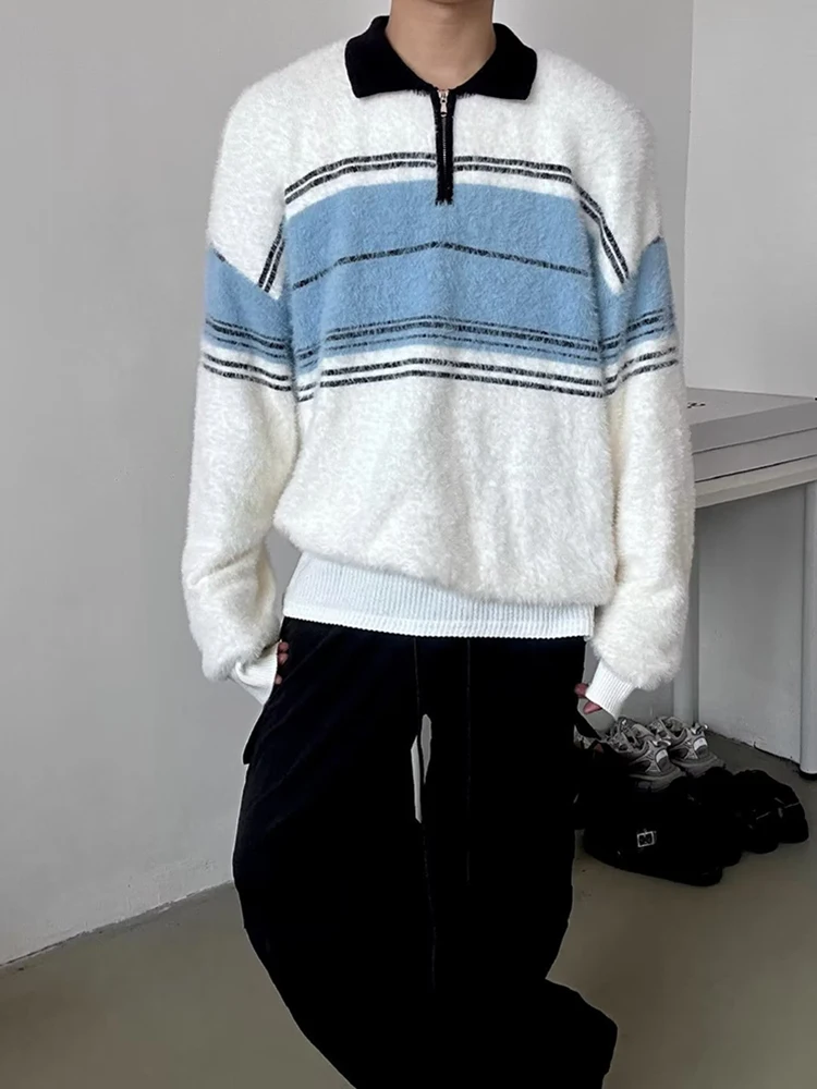 Wiaofellas Fall Men Casual Lapel Furry Pullover Winter Long Sleeve Zip Sweater Youth Contract Color Striped Knitwear Knit Polos Shirts