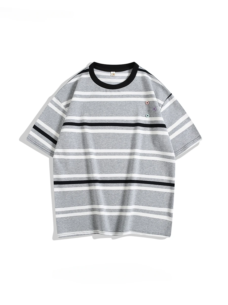 Wiaofellas - Men's Colorful Button Striped Cotton Short-sleeved Shirt Trendy Summer Street Loose Casual Versatile Pullovers Tops Male Clothes