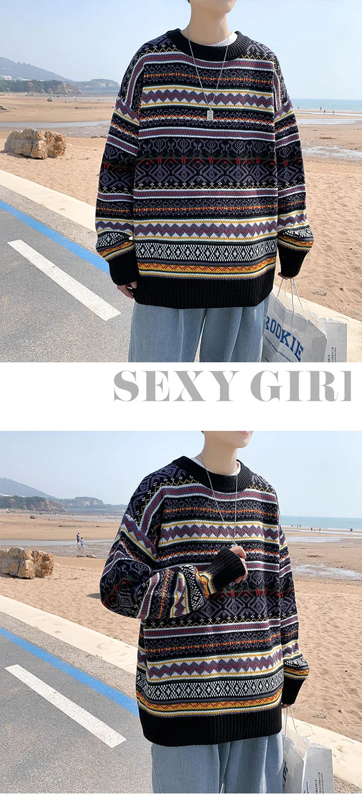 Wiaofellas Men's Fashion Colorblock Knit Sweater Winter New Thickened Pullover Harajuku Round Neck Loose Shirt Jacket Men Korean Clothes