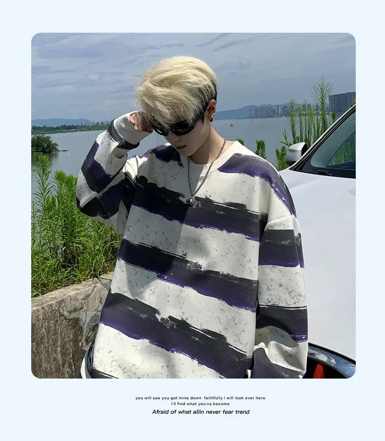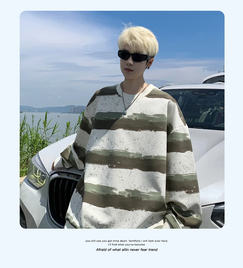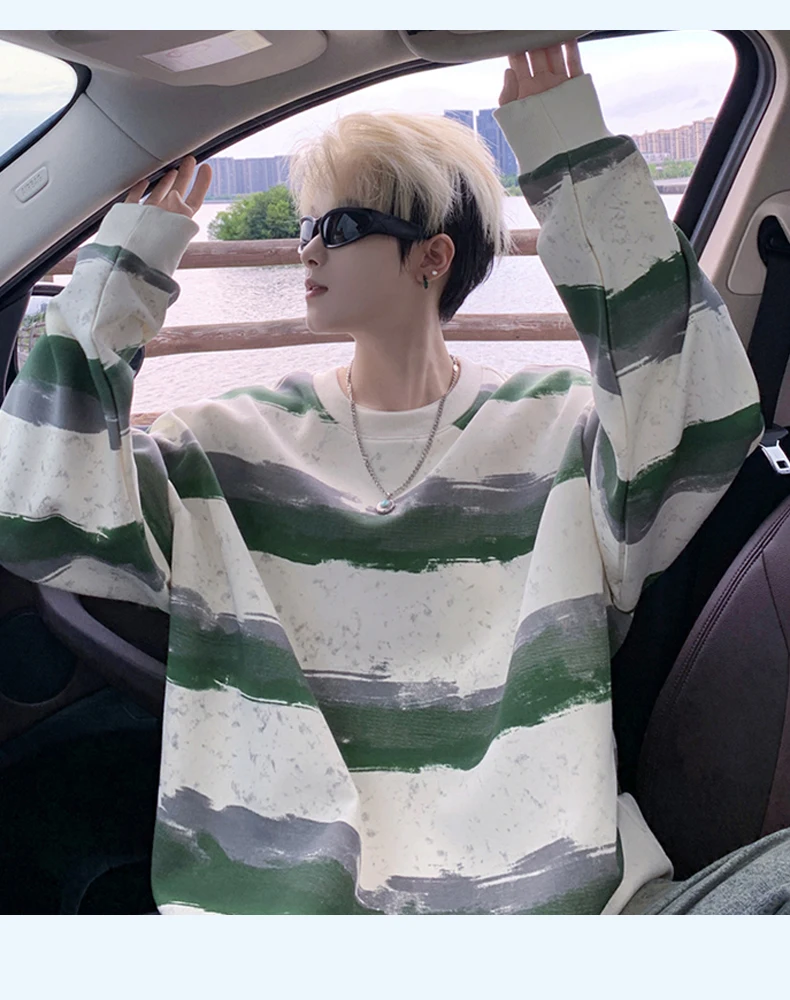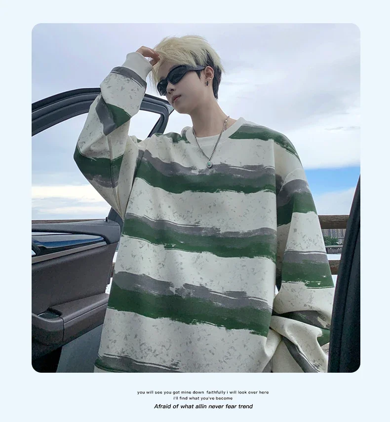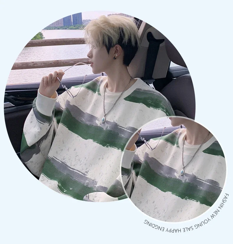 WIAOFELLAS - Autumn Korean Striped Sweatshirt Men Spring Trendy Loose Round Neck Tops Korean Version Lazy Style Hoodie Men Outerwear Pullover