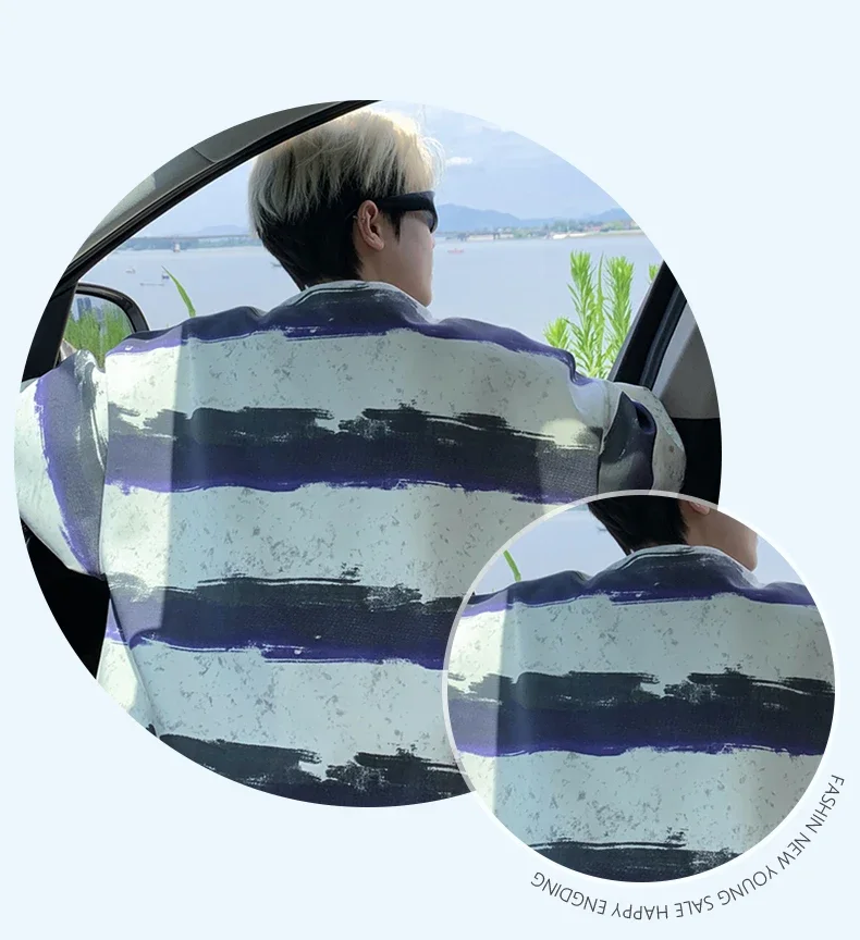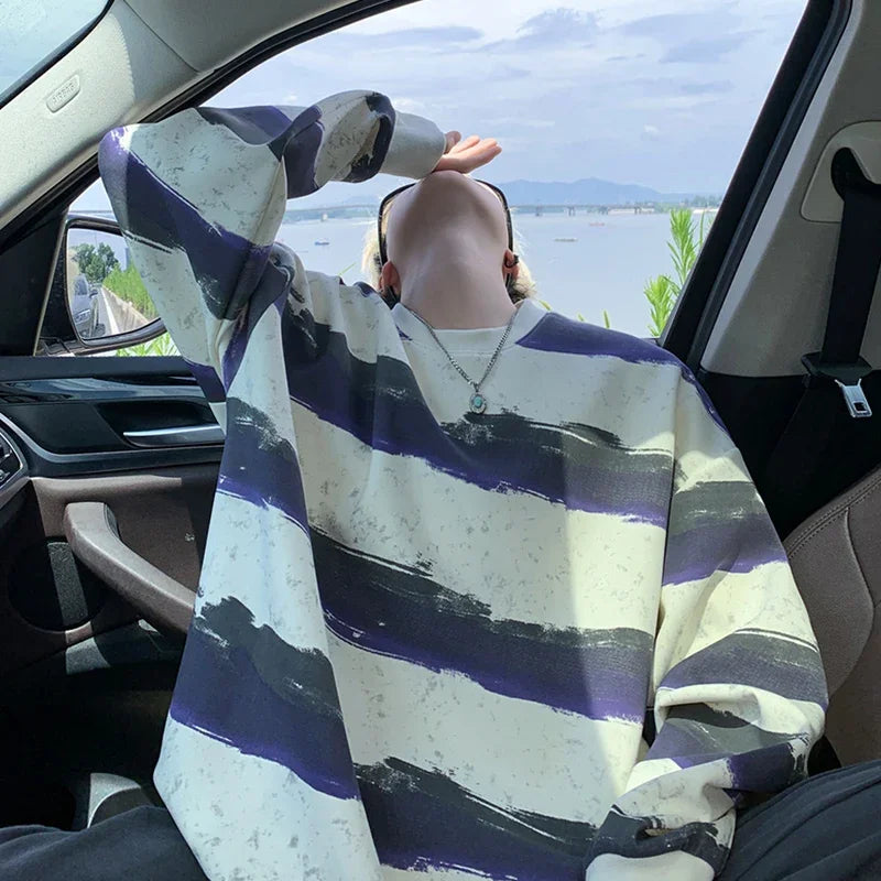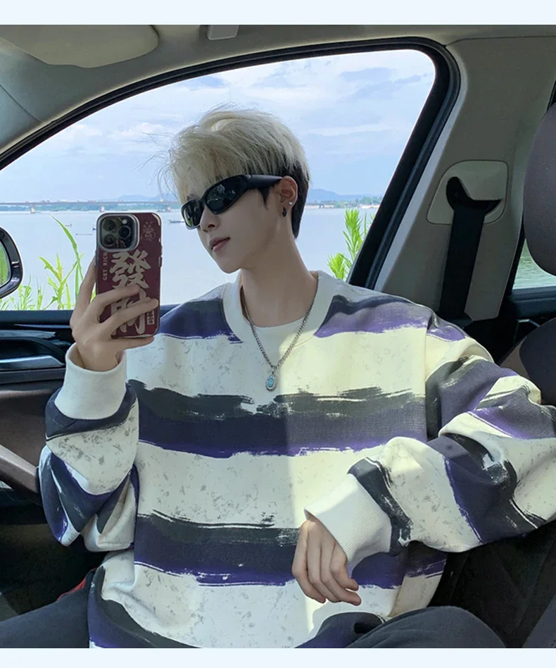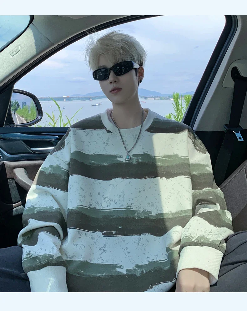 WIAOFELLAS - Autumn Korean Striped Sweatshirt Men Spring Trendy Loose Round Neck Tops Korean Version Lazy Style Hoodie Men Outerwear Pullover