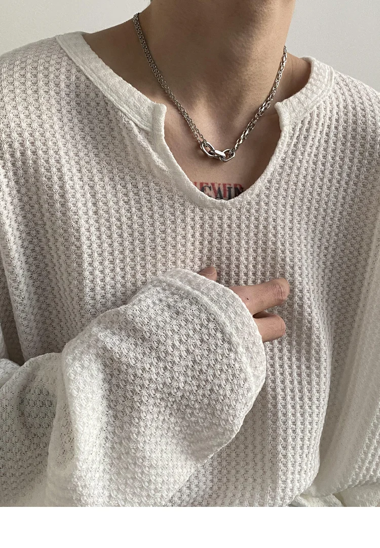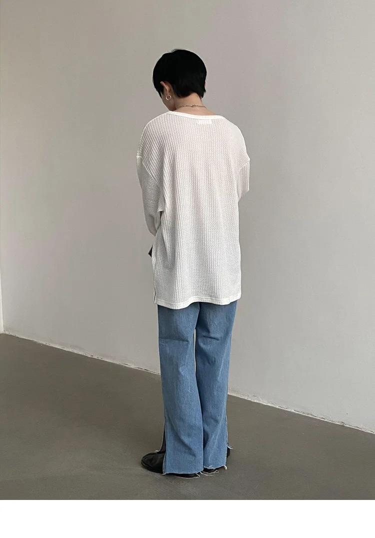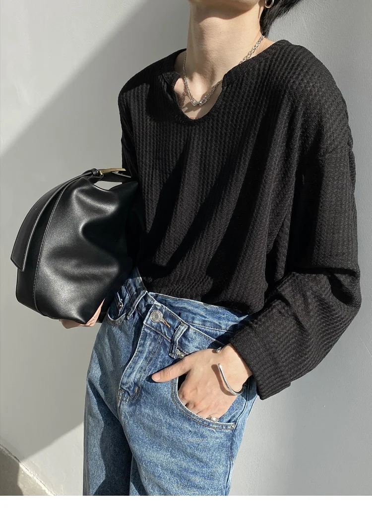 WIAOFELLAS - Autumn New Thin Concave Convex Collar Pullover Loose Long Sleeve Black Gray White T-shirt Unisex Sun Protection 2D0283