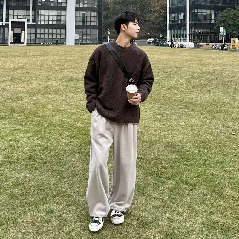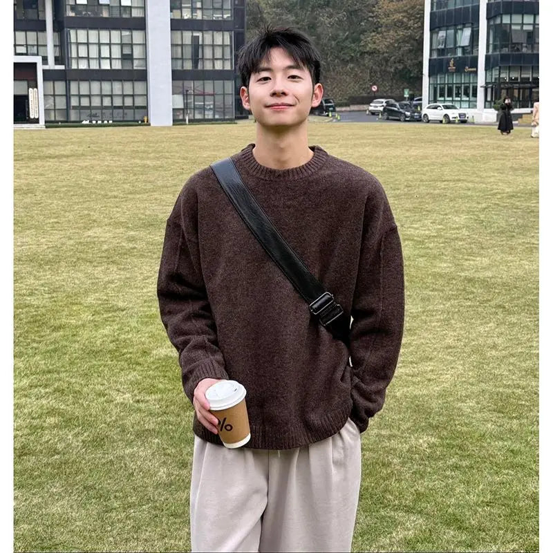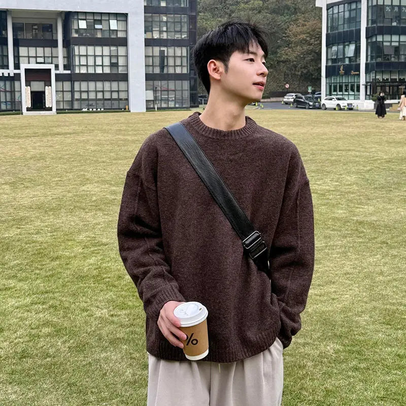 WIAOFELLAS - coffee-colored pullover sweater men's autumn and winter lazy style high-end Korean round neck knitted base shirt