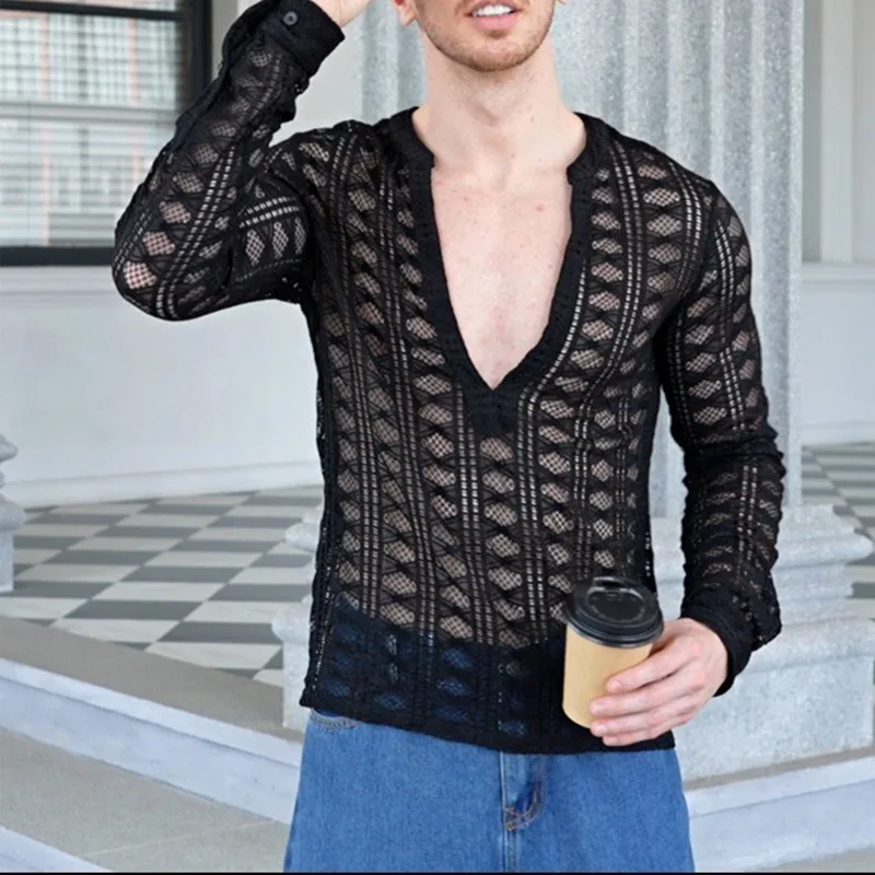 WIAOFELLAS - Fishing Net Transparent Shirt For Men V-neck Lace Long Sleeved Tshirts Tops Autumn Fashion Sexy Mesh Hollow Out Shirts Pullover
