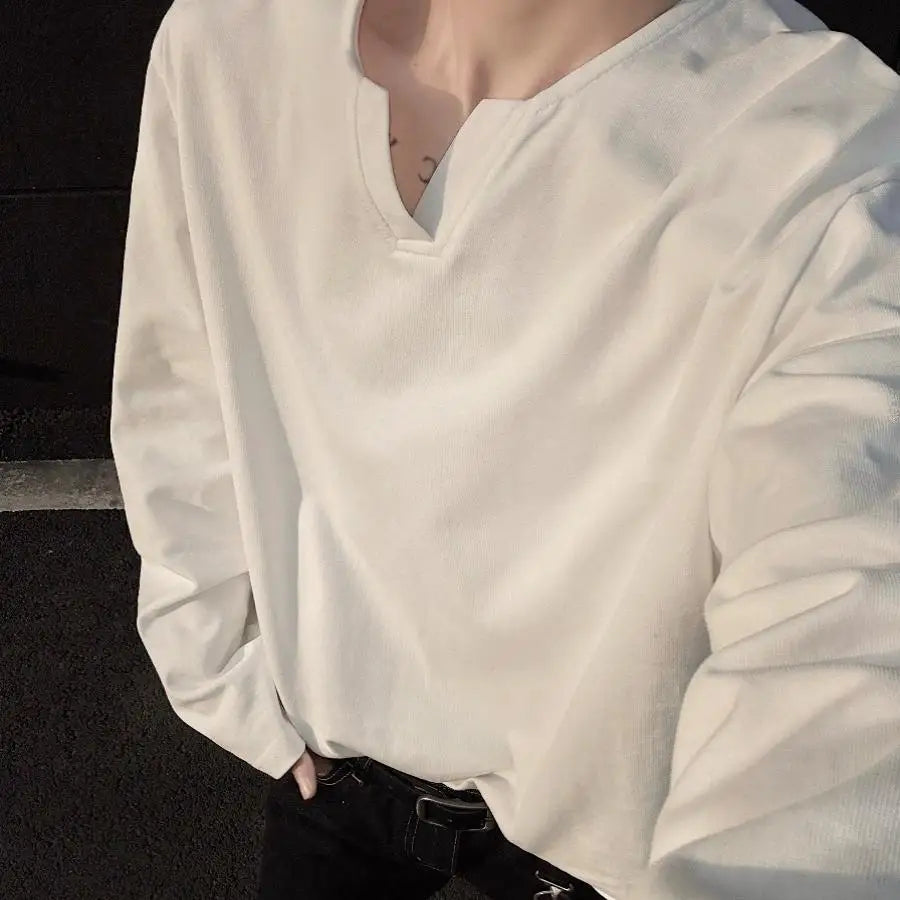 WIAOFELLAS  -  Spring Cotton Long Sleeved T-shirt Men Fashion White V-neck T Shirt Men Streetwear Korean Loose Pullover T Shirt Mens Top M-2XL